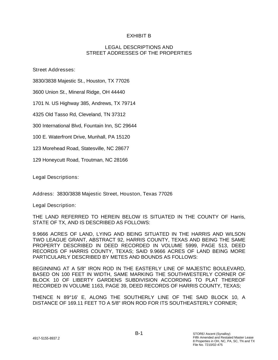 STORE/ Ascent (Synalloy) Fifth Amended and Restated Master Lease 8 Properties in OH, NC, PA, SC, TN and TX File No. 7210/02-475 B-1 4917-5155-8937.2 EXHIBIT B LEGAL DESCRIPTIONS AND STREET ADDRESSES OF THE PROPERTIES Street Addresses: 3830/3838 Majestic St., Houston, TX 77026 3600 Union St., Mineral Ridge, OH 44440 1701 N. US Highway 385, Andrews, TX 79714 4325 Old Tasso Rd, Cleveland, TN 37312 300 International Blvd, Fountain Inn, SC 29644 100 E. Waterfront Drive, Munhall, PA 15120 123 Morehead Road, Statesville, NC 28677 129 Honeycutt Road, Troutman, NC 28166 Legal Descriptions: Address: 3830/3838 Majestic Street, Houston, Texas 77026 Legal Description: THE LAND REFERRED TO HEREIN BELOW IS SITUATED IN THE COUNTY OF Harris, STATE OF TX, AND IS DESCRIBED AS FOLLOWS: 9.9666 ACRES OF LAND, LYING AND BEING SITUATED IN THE HARRIS AND WILSON TWO LEAGUE GRANT, ABSTRACT 92, HARRIS COUNTY, TEXAS AND BEING THE SAME PROPERTY DESCRIBED IN DEED RECORDED IN VOLUME 5999, PAGE 513, DEED RECORDS OF HARRIS COUNTY, TEXAS; SAID 9.9666 ACRES OF LAND BEING MORE PARTICULARLY DESCRIBED BY METES AND BOUNDS AS FOLLOWS: BEGINNING AT A 5/8" IRON ROD IN THE EASTERLY LINE OF MAJESTIC BOULEVARD, BASED ON 100 FEET IN WIDTH, SAME MARKING THE SOUTHWESTERLY CORNER OF BLOCK 10 OF LIBERTY GARDENS SUBDIVISION ACCORDING TO PLAT THEREOF RECORDED IN VOLUME 1163, PAGE 39, DEED RECORDS OF HARRIS COUNTY, TEXAS; THENCE N 89°16' E, ALONG THE SOUTHERLY LINE OF THE SAID BLOCK 10, A DISTANCE OF 169.11 FEET TO A 5/8" IRON ROD FOR ITS SOUTHEASTERLY CORNER;