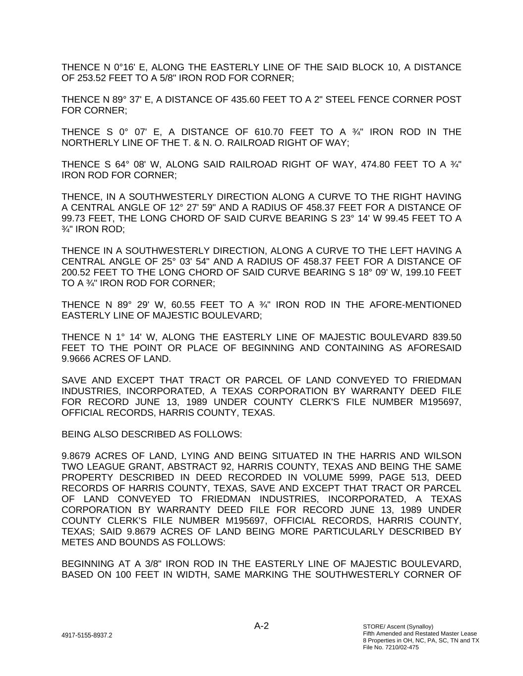 STORE/ Ascent (Synalloy) Fifth Amended and Restated Master Lease 8 Properties in OH, NC, PA, SC, TN and TX File No. 7210/02-475 A-2 4917-5155-8937.2 THENCE N 0°16' E, ALONG THE EASTERLY LINE OF THE SAID BLOCK 10, A DISTANCE OF 253.52 FEET TO A 5/8" IRON ROD FOR CORNER; THENCE N 89° 37' E, A DISTANCE OF 435.60 FEET TO A 2" STEEL FENCE CORNER POST FOR CORNER; THENCE S 0° 07' E, A DISTANCE OF 610.70 FEET TO A ¾" IRON ROD IN THE NORTHERLY LINE OF THE T. & N. O. RAILROAD RIGHT OF WAY; THENCE S 64° 08' W, ALONG SAID RAILROAD RIGHT OF WAY, 474.80 FEET TO A ¾" IRON ROD FOR CORNER; THENCE, IN A SOUTHWESTERLY DIRECTION ALONG A CURVE TO THE RIGHT HAVING A CENTRAL ANGLE OF 12° 27' 59" AND A RADIUS OF 458.37 FEET FOR A DISTANCE OF 99.73 FEET, THE LONG CHORD OF SAID CURVE BEARING S 23° 14' W 99.45 FEET TO A ¾" IRON ROD; THENCE IN A SOUTHWESTERLY DIRECTION, ALONG A CURVE TO THE LEFT HAVING A CENTRAL ANGLE OF 25° 03' 54" AND A RADIUS OF 458.37 FEET FOR A DISTANCE OF 200.52 FEET TO THE LONG CHORD OF SAID CURVE BEARING S 18° 09' W, 199.10 FEET TO A ¾" IRON ROD FOR CORNER; THENCE N 89° 29' W, 60.55 FEET TO A ¾" IRON ROD IN THE AFORE-MENTIONED EASTERLY LINE OF MAJESTIC BOULEVARD; THENCE N 1° 14' W, ALONG THE EASTERLY LINE OF MAJESTIC BOULEVARD 839.50 FEET TO THE POINT OR PLACE OF BEGINNING AND CONTAINING AS AFORESAID 9.9666 ACRES OF LAND. SAVE AND EXCEPT THAT TRACT OR PARCEL OF LAND CONVEYED TO FRIEDMAN INDUSTRIES, INCORPORATED, A TEXAS CORPORATION BY WARRANTY DEED FILE FOR RECORD JUNE 13, 1989 UNDER COUNTY CLERK'S FILE NUMBER M195697, OFFICIAL RECORDS, HARRIS COUNTY, TEXAS. BEING ALSO DESCRIBED AS FOLLOWS: 9.8679 ACRES OF LAND, LYING AND BEING SITUATED IN THE HARRIS AND WILSON TWO LEAGUE GRANT, ABSTRACT 92, HARRIS COUNTY, TEXAS AND BEING THE SAME PROPERTY DESCRIBED IN DEED RECORDED IN VOLUME 5999, PAGE 513, DEED RECORDS OF HARRIS COUNTY, TEXAS, SAVE AND EXCEPT THAT TRACT OR PARCEL OF LAND CONVEYED TO FRIEDMAN INDUSTRIES, INCORPORATED, A TEXAS CORPORATION BY WARRANTY DEED FILE FOR RECORD JUNE 13, 1989 UNDER COUNTY CLERK'S FILE NUMBER M195697, OFFICIAL RECORDS, HARRIS COUNTY, TEXAS; SAID 9.8679 ACRES OF LAND BEING MORE PARTICULARLY DESCRIBED BY METES AND BOUNDS AS FOLLOWS: BEGINNING AT A 3/8" IRON ROD IN THE EASTERLY LINE OF MAJESTIC BOULEVARD, BASED ON 100 FEET IN WIDTH, SAME MARKING THE SOUTHWESTERLY CORNER OF
