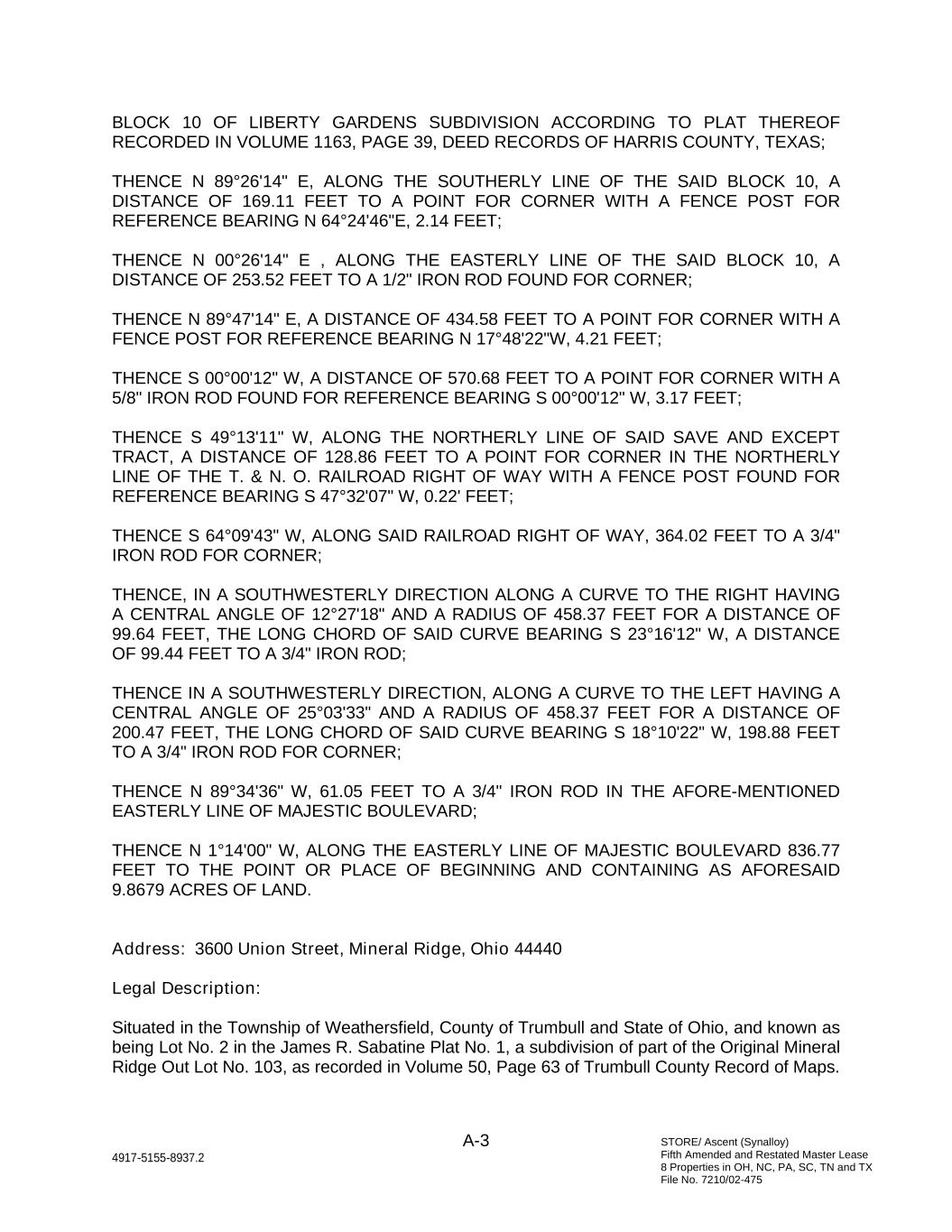 STORE/ Ascent (Synalloy) Fifth Amended and Restated Master Lease 8 Properties in OH, NC, PA, SC, TN and TX File No. 7210/02-475 A-3 4917-5155-8937.2 BLOCK 10 OF LIBERTY GARDENS SUBDIVISION ACCORDING TO PLAT THEREOF RECORDED IN VOLUME 1163, PAGE 39, DEED RECORDS OF HARRIS COUNTY, TEXAS; THENCE N 89°26'14" E, ALONG THE SOUTHERLY LINE OF THE SAID BLOCK 10, A DISTANCE OF 169.11 FEET TO A POINT FOR CORNER WITH A FENCE POST FOR REFERENCE BEARING N 64°24'46"E, 2.14 FEET; THENCE N 00°26'14" E , ALONG THE EASTERLY LINE OF THE SAID BLOCK 10, A DISTANCE OF 253.52 FEET TO A 1/2" IRON ROD FOUND FOR CORNER; THENCE N 89°47'14" E, A DISTANCE OF 434.58 FEET TO A POINT FOR CORNER WITH A FENCE POST FOR REFERENCE BEARING N 17°48'22"W, 4.21 FEET; THENCE S 00°00'12" W, A DISTANCE OF 570.68 FEET TO A POINT FOR CORNER WITH A 5/8" IRON ROD FOUND FOR REFERENCE BEARING S 00°00'12" W, 3.17 FEET; THENCE S 49°13'11" W, ALONG THE NORTHERLY LINE OF SAID SAVE AND EXCEPT TRACT, A DISTANCE OF 128.86 FEET TO A POINT FOR CORNER IN THE NORTHERLY LINE OF THE T. & N. O. RAILROAD RIGHT OF WAY WITH A FENCE POST FOUND FOR REFERENCE BEARING S 47°32'07" W, 0.22' FEET; THENCE S 64°09'43" W, ALONG SAID RAILROAD RIGHT OF WAY, 364.02 FEET TO A 3/4" IRON ROD FOR CORNER; THENCE, IN A SOUTHWESTERLY DIRECTION ALONG A CURVE TO THE RIGHT HAVING A CENTRAL ANGLE OF 12°27'18" AND A RADIUS OF 458.37 FEET FOR A DISTANCE OF 99.64 FEET, THE LONG CHORD OF SAID CURVE BEARING S 23°16'12" W, A DISTANCE OF 99.44 FEET TO A 3/4" IRON ROD; THENCE IN A SOUTHWESTERLY DIRECTION, ALONG A CURVE TO THE LEFT HAVING A CENTRAL ANGLE OF 25°03'33" AND A RADIUS OF 458.37 FEET FOR A DISTANCE OF 200.47 FEET, THE LONG CHORD OF SAID CURVE BEARING S 18°10'22" W, 198.88 FEET TO A 3/4" IRON ROD FOR CORNER; THENCE N 89°34'36" W, 61.05 FEET TO A 3/4" IRON ROD IN THE AFORE-MENTIONED EASTERLY LINE OF MAJESTIC BOULEVARD; THENCE N 1°14'00" W, ALONG THE EASTERLY LINE OF MAJESTIC BOULEVARD 836.77 FEET TO THE POINT OR PLACE OF BEGINNING AND CONTAINING AS AFORESAID 9.8679 ACRES OF LAND. Address: 3600 Union Street, Mineral Ridge, Ohio 44440 Legal Description: Situated in the Township of Weathersfield, County of Trumbull and State of Ohio, and known as being Lot No. 2 in the James R. Sabatine Plat No. 1, a subdivision of part of the Original Mineral Ridge Out Lot No. 103, as recorded in Volume 50, Page 63 of Trumbull County Record of Maps.