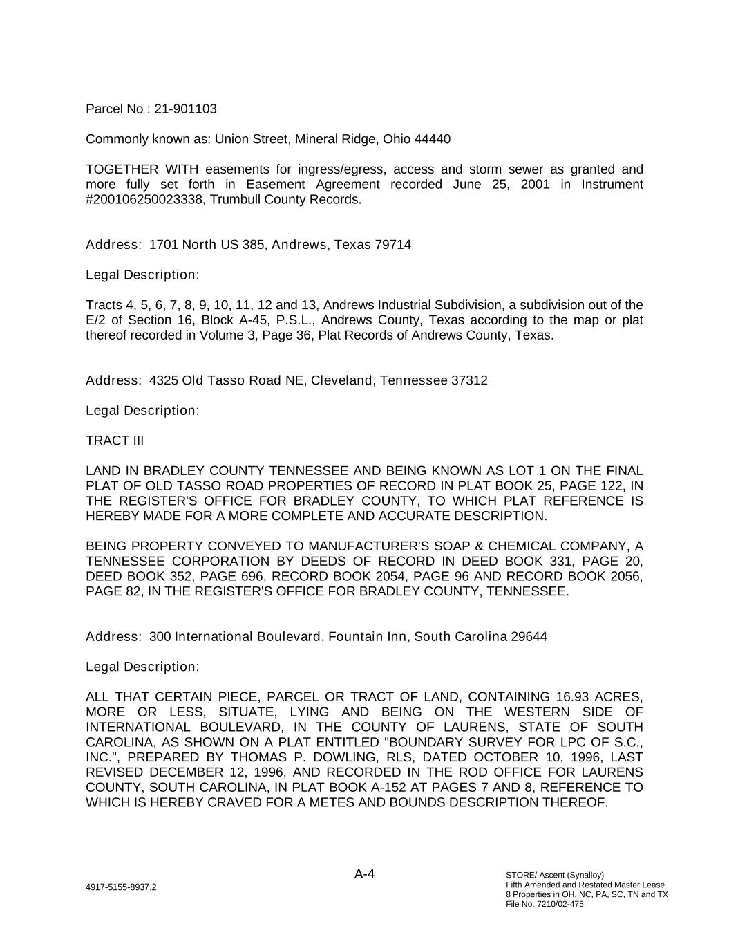 STORE/ Ascent (Synalloy) Fifth Amended and Restated Master Lease 8 Properties in OH, NC, PA, SC, TN and TX File No. 7210/02-475 A-4 4917-5155-8937.2 Parcel No : 21-901103 Commonly known as: Union Street, Mineral Ridge, Ohio 44440 TOGETHER WITH easements for ingress/egress, access and storm sewer as granted and more fully set forth in Easement Agreement recorded June 25, 2001 in Instrument #200106250023338, Trumbull County Records. Address: 1701 North US 385, Andrews, Texas 79714 Legal Description: Tracts 4, 5, 6, 7, 8, 9, 10, 11, 12 and 13, Andrews Industrial Subdivision, a subdivision out of the E/2 of Section 16, Block A-45, P.S.L., Andrews County, Texas according to the map or plat thereof recorded in Volume 3, Page 36, Plat Records of Andrews County, Texas. Address: 4325 Old Tasso Road NE, Cleveland, Tennessee 37312 Legal Description: TRACT III LAND IN BRADLEY COUNTY TENNESSEE AND BEING KNOWN AS LOT 1 ON THE FINAL PLAT OF OLD TASSO ROAD PROPERTIES OF RECORD IN PLAT BOOK 25, PAGE 122, IN THE REGISTER'S OFFICE FOR BRADLEY COUNTY, TO WHICH PLAT REFERENCE IS HEREBY MADE FOR A MORE COMPLETE AND ACCURATE DESCRIPTION. BEING PROPERTY CONVEYED TO MANUFACTURER'S SOAP & CHEMICAL COMPANY, A TENNESSEE CORPORATION BY DEEDS OF RECORD IN DEED BOOK 331, PAGE 20, DEED BOOK 352, PAGE 696, RECORD BOOK 2054, PAGE 96 AND RECORD BOOK 2056, PAGE 82, IN THE REGISTER'S OFFICE FOR BRADLEY COUNTY, TENNESSEE. Address: 300 International Boulevard, Fountain Inn, South Carolina 29644 Legal Description: ALL THAT CERTAIN PIECE, PARCEL OR TRACT OF LAND, CONTAINING 16.93 ACRES, MORE OR LESS, SITUATE, LYING AND BEING ON THE WESTERN SIDE OF INTERNATIONAL BOULEVARD, IN THE COUNTY OF LAURENS, STATE OF SOUTH CAROLINA, AS SHOWN ON A PLAT ENTITLED "BOUNDARY SURVEY FOR LPC OF S.C., INC.", PREPARED BY THOMAS P. DOWLING, RLS, DATED OCTOBER 10, 1996, LAST REVISED DECEMBER 12, 1996, AND RECORDED IN THE ROD OFFICE FOR LAURENS COUNTY, SOUTH CAROLINA, IN PLAT BOOK A-152 AT PAGES 7 AND 8, REFERENCE TO WHICH IS HEREBY CRAVED FOR A METES AND BOUNDS DESCRIPTION THEREOF.
