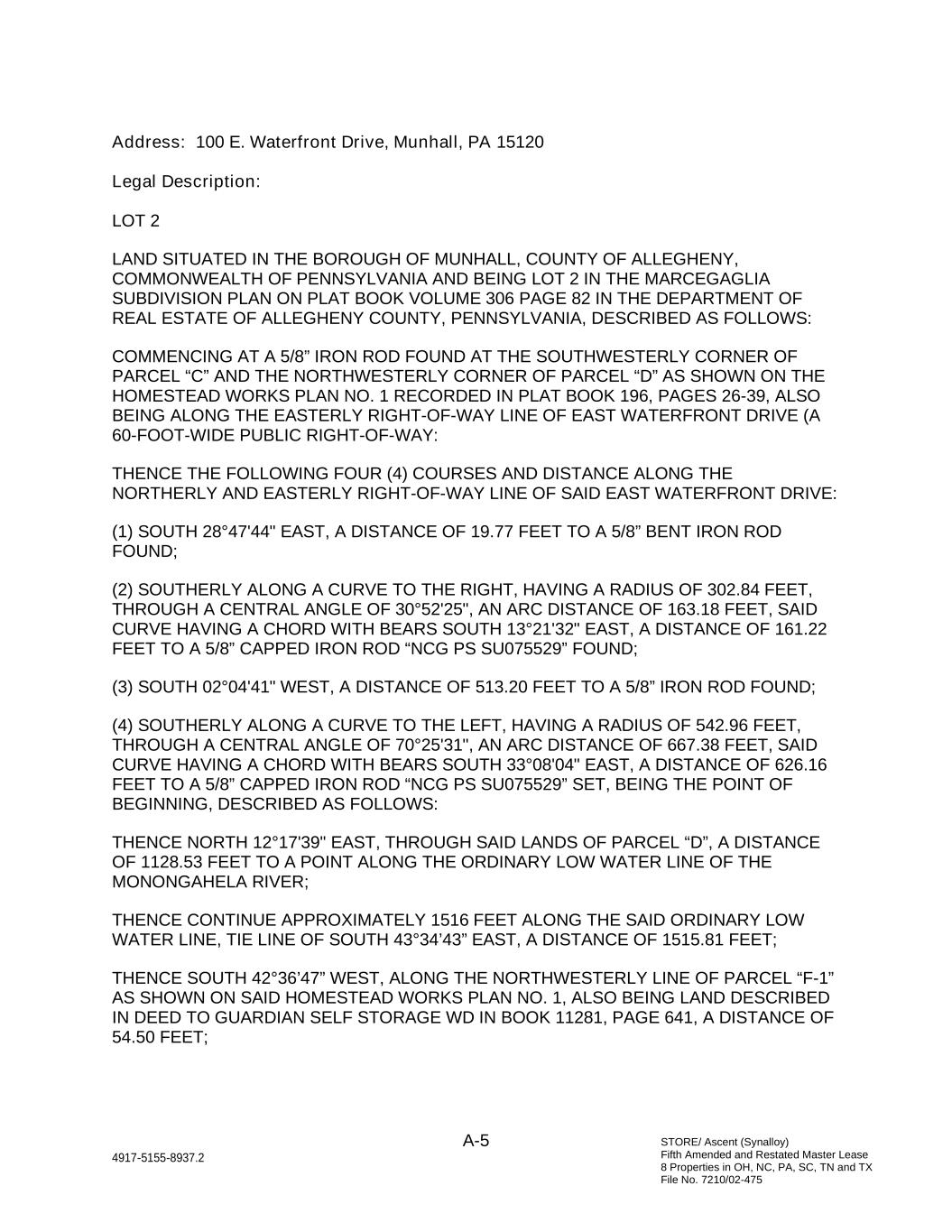 STORE/ Ascent (Synalloy) Fifth Amended and Restated Master Lease 8 Properties in OH, NC, PA, SC, TN and TX File No. 7210/02-475 A-5 4917-5155-8937.2 Address: 100 E. Waterfront Drive, Munhall, PA 15120 Legal Description: LOT 2 LAND SITUATED IN THE BOROUGH OF MUNHALL, COUNTY OF ALLEGHENY, COMMONWEALTH OF PENNSYLVANIA AND BEING LOT 2 IN THE MARCEGAGLIA SUBDIVISION PLAN ON PLAT BOOK VOLUME 306 PAGE 82 IN THE DEPARTMENT OF REAL ESTATE OF ALLEGHENY COUNTY, PENNSYLVANIA, DESCRIBED AS FOLLOWS: COMMENCING AT A 5/8” IRON ROD FOUND AT THE SOUTHWESTERLY CORNER OF PARCEL “C” AND THE NORTHWESTERLY CORNER OF PARCEL “D” AS SHOWN ON THE HOMESTEAD WORKS PLAN NO. 1 RECORDED IN PLAT BOOK 196, PAGES 26-39, ALSO BEING ALONG THE EASTERLY RIGHT-OF-WAY LINE OF EAST WATERFRONT DRIVE (A 60-FOOT-WIDE PUBLIC RIGHT-OF-WAY: THENCE THE FOLLOWING FOUR (4) COURSES AND DISTANCE ALONG THE NORTHERLY AND EASTERLY RIGHT-OF-WAY LINE OF SAID EAST WATERFRONT DRIVE: (1) SOUTH 28°47'44" EAST, A DISTANCE OF 19.77 FEET TO A 5/8” BENT IRON ROD FOUND; (2) SOUTHERLY ALONG A CURVE TO THE RIGHT, HAVING A RADIUS OF 302.84 FEET, THROUGH A CENTRAL ANGLE OF 30°52'25", AN ARC DISTANCE OF 163.18 FEET, SAID CURVE HAVING A CHORD WITH BEARS SOUTH 13°21'32" EAST, A DISTANCE OF 161.22 FEET TO A 5/8” CAPPED IRON ROD “NCG PS SU075529” FOUND; (3) SOUTH 02°04'41" WEST, A DISTANCE OF 513.20 FEET TO A 5/8” IRON ROD FOUND; (4) SOUTHERLY ALONG A CURVE TO THE LEFT, HAVING A RADIUS OF 542.96 FEET, THROUGH A CENTRAL ANGLE OF 70°25'31", AN ARC DISTANCE OF 667.38 FEET, SAID CURVE HAVING A CHORD WITH BEARS SOUTH 33°08'04" EAST, A DISTANCE OF 626.16 FEET TO A 5/8” CAPPED IRON ROD “NCG PS SU075529” SET, BEING THE POINT OF BEGINNING, DESCRIBED AS FOLLOWS: THENCE NORTH 12°17'39" EAST, THROUGH SAID LANDS OF PARCEL “D”, A DISTANCE OF 1128.53 FEET TO A POINT ALONG THE ORDINARY LOW WATER LINE OF THE MONONGAHELA RIVER; THENCE CONTINUE APPROXIMATELY 1516 FEET ALONG THE SAID ORDINARY LOW WATER LINE, TIE LINE OF SOUTH 43°34’43” EAST, A DISTANCE OF 1515.81 FEET; THENCE SOUTH 42°36’47” WEST, ALONG THE NORTHWESTERLY LINE OF PARCEL “F-1” AS SHOWN ON SAID HOMESTEAD WORKS PLAN NO. 1, ALSO BEING LAND DESCRIBED IN DEED TO GUARDIAN SELF STORAGE WD IN BOOK 11281, PAGE 641, A DISTANCE OF 54.50 FEET;