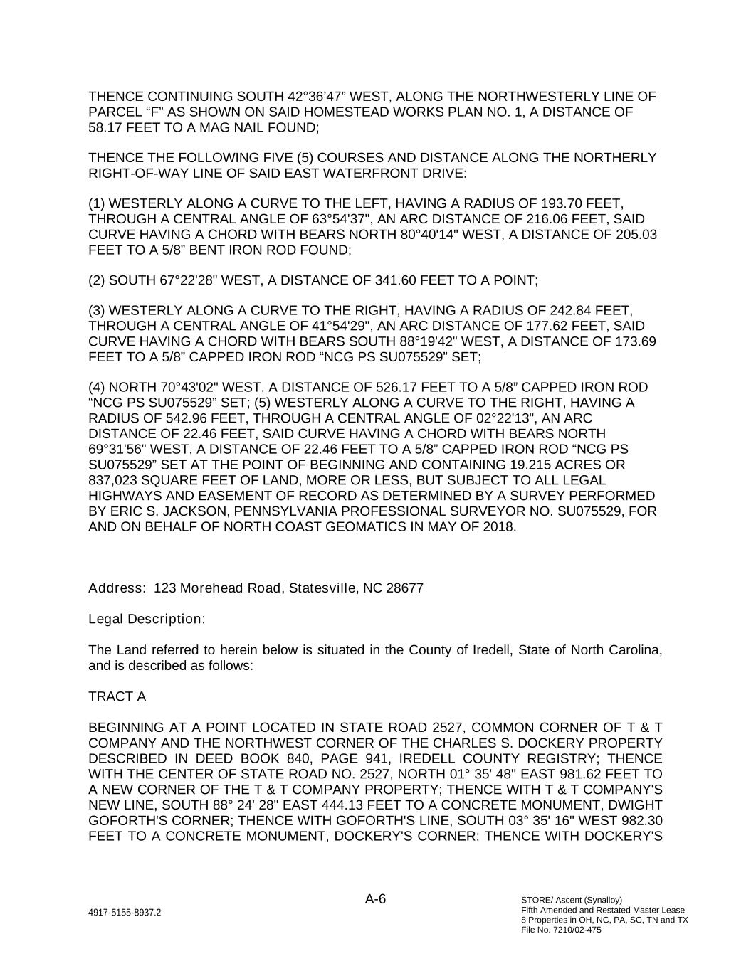 STORE/ Ascent (Synalloy) Fifth Amended and Restated Master Lease 8 Properties in OH, NC, PA, SC, TN and TX File No. 7210/02-475 A-6 4917-5155-8937.2 THENCE CONTINUING SOUTH 42°36’47” WEST, ALONG THE NORTHWESTERLY LINE OF PARCEL “F” AS SHOWN ON SAID HOMESTEAD WORKS PLAN NO. 1, A DISTANCE OF 58.17 FEET TO A MAG NAIL FOUND; THENCE THE FOLLOWING FIVE (5) COURSES AND DISTANCE ALONG THE NORTHERLY RIGHT-OF-WAY LINE OF SAID EAST WATERFRONT DRIVE: (1) WESTERLY ALONG A CURVE TO THE LEFT, HAVING A RADIUS OF 193.70 FEET, THROUGH A CENTRAL ANGLE OF 63°54'37", AN ARC DISTANCE OF 216.06 FEET, SAID CURVE HAVING A CHORD WITH BEARS NORTH 80°40'14" WEST, A DISTANCE OF 205.03 FEET TO A 5/8” BENT IRON ROD FOUND; (2) SOUTH 67°22'28" WEST, A DISTANCE OF 341.60 FEET TO A POINT; (3) WESTERLY ALONG A CURVE TO THE RIGHT, HAVING A RADIUS OF 242.84 FEET, THROUGH A CENTRAL ANGLE OF 41°54'29", AN ARC DISTANCE OF 177.62 FEET, SAID CURVE HAVING A CHORD WITH BEARS SOUTH 88°19'42" WEST, A DISTANCE OF 173.69 FEET TO A 5/8” CAPPED IRON ROD “NCG PS SU075529” SET; (4) NORTH 70°43'02" WEST, A DISTANCE OF 526.17 FEET TO A 5/8” CAPPED IRON ROD “NCG PS SU075529” SET; (5) WESTERLY ALONG A CURVE TO THE RIGHT, HAVING A RADIUS OF 542.96 FEET, THROUGH A CENTRAL ANGLE OF 02°22'13", AN ARC DISTANCE OF 22.46 FEET, SAID CURVE HAVING A CHORD WITH BEARS NORTH 69°31'56" WEST, A DISTANCE OF 22.46 FEET TO A 5/8” CAPPED IRON ROD “NCG PS SU075529” SET AT THE POINT OF BEGINNING AND CONTAINING 19.215 ACRES OR 837,023 SQUARE FEET OF LAND, MORE OR LESS, BUT SUBJECT TO ALL LEGAL HIGHWAYS AND EASEMENT OF RECORD AS DETERMINED BY A SURVEY PERFORMED BY ERIC S. JACKSON, PENNSYLVANIA PROFESSIONAL SURVEYOR NO. SU075529, FOR AND ON BEHALF OF NORTH COAST GEOMATICS IN MAY OF 2018. Address: 123 Morehead Road, Statesville, NC 28677 Legal Description: The Land referred to herein below is situated in the County of Iredell, State of North Carolina, and is described as follows: TRACT A BEGINNING AT A POINT LOCATED IN STATE ROAD 2527, COMMON CORNER OF T & T COMPANY AND THE NORTHWEST CORNER OF THE CHARLES S. DOCKERY PROPERTY DESCRIBED IN DEED BOOK 840, PAGE 941, IREDELL COUNTY REGISTRY; THENCE WITH THE CENTER OF STATE ROAD NO. 2527, NORTH 01° 35' 48'' EAST 981.62 FEET TO A NEW CORNER OF THE T & T COMPANY PROPERTY; THENCE WITH T & T COMPANY'S NEW LINE, SOUTH 88° 24' 28" EAST 444.13 FEET TO A CONCRETE MONUMENT, DWIGHT GOFORTH'S CORNER; THENCE WITH GOFORTH'S LINE, SOUTH 03° 35' 16" WEST 982.30 FEET TO A CONCRETE MONUMENT, DOCKERY'S CORNER; THENCE WITH DOCKERY'S