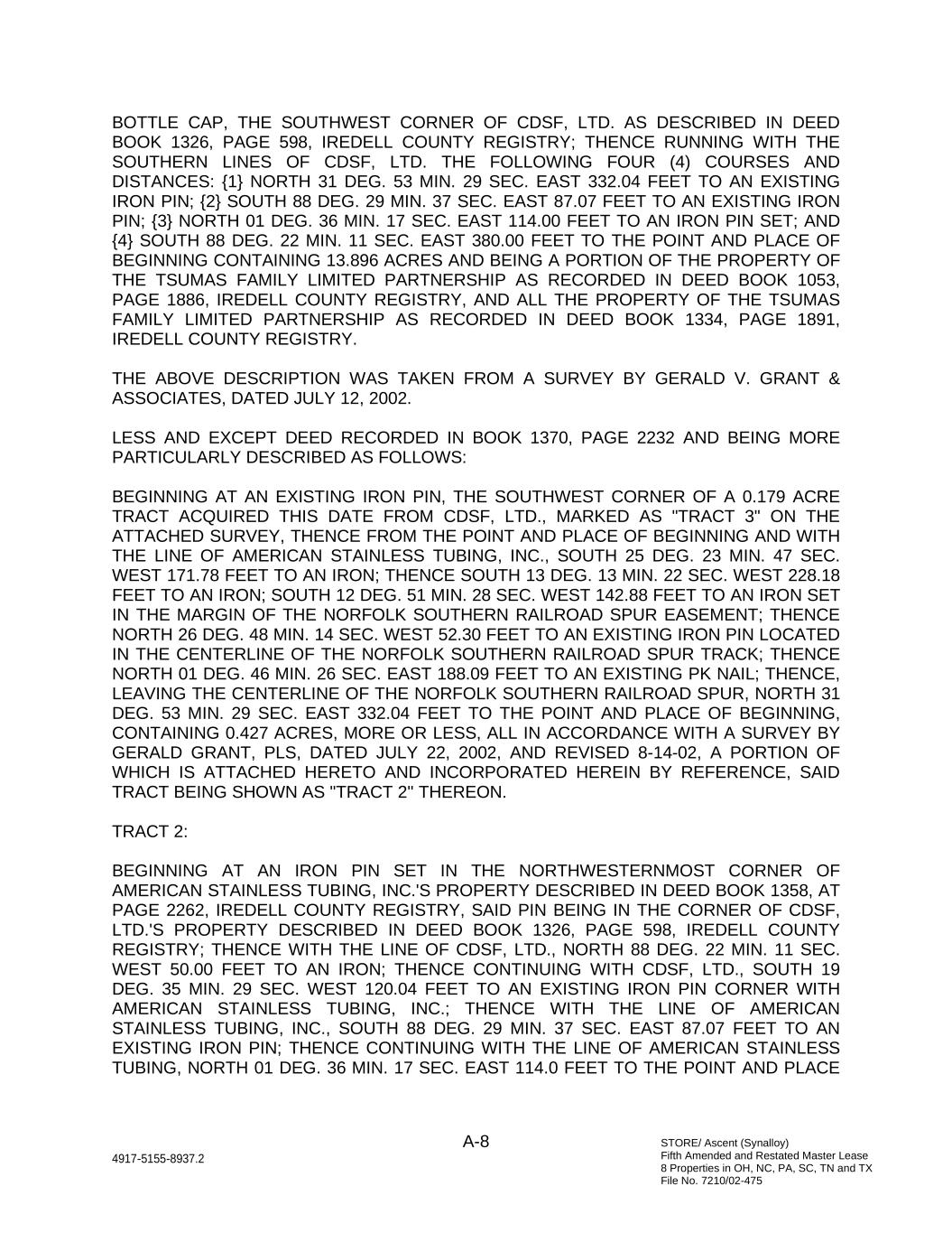 STORE/ Ascent (Synalloy) Fifth Amended and Restated Master Lease 8 Properties in OH, NC, PA, SC, TN and TX File No. 7210/02-475 A-8 4917-5155-8937.2 BOTTLE CAP, THE SOUTHWEST CORNER OF CDSF, LTD. AS DESCRIBED IN DEED BOOK 1326, PAGE 598, IREDELL COUNTY REGISTRY; THENCE RUNNING WITH THE SOUTHERN LINES OF CDSF, LTD. THE FOLLOWING FOUR (4) COURSES AND DISTANCES: {1} NORTH 31 DEG. 53 MIN. 29 SEC. EAST 332.04 FEET TO AN EXISTING IRON PIN; {2} SOUTH 88 DEG. 29 MIN. 37 SEC. EAST 87.07 FEET TO AN EXISTING IRON PIN; {3} NORTH 01 DEG. 36 MIN. 17 SEC. EAST 114.00 FEET TO AN IRON PIN SET; AND {4} SOUTH 88 DEG. 22 MIN. 11 SEC. EAST 380.00 FEET TO THE POINT AND PLACE OF BEGINNING CONTAINING 13.896 ACRES AND BEING A PORTION OF THE PROPERTY OF THE TSUMAS FAMILY LIMITED PARTNERSHIP AS RECORDED IN DEED BOOK 1053, PAGE 1886, IREDELL COUNTY REGISTRY, AND ALL THE PROPERTY OF THE TSUMAS FAMILY LIMITED PARTNERSHIP AS RECORDED IN DEED BOOK 1334, PAGE 1891, IREDELL COUNTY REGISTRY. THE ABOVE DESCRIPTION WAS TAKEN FROM A SURVEY BY GERALD V. GRANT & ASSOCIATES, DATED JULY 12, 2002. LESS AND EXCEPT DEED RECORDED IN BOOK 1370, PAGE 2232 AND BEING MORE PARTICULARLY DESCRIBED AS FOLLOWS: BEGINNING AT AN EXISTING IRON PIN, THE SOUTHWEST CORNER OF A 0.179 ACRE TRACT ACQUIRED THIS DATE FROM CDSF, LTD., MARKED AS "TRACT 3" ON THE ATTACHED SURVEY, THENCE FROM THE POINT AND PLACE OF BEGINNING AND WITH THE LINE OF AMERICAN STAINLESS TUBING, INC., SOUTH 25 DEG. 23 MIN. 47 SEC. WEST 171.78 FEET TO AN IRON; THENCE SOUTH 13 DEG. 13 MIN. 22 SEC. WEST 228.18 FEET TO AN IRON; SOUTH 12 DEG. 51 MIN. 28 SEC. WEST 142.88 FEET TO AN IRON SET IN THE MARGIN OF THE NORFOLK SOUTHERN RAILROAD SPUR EASEMENT; THENCE NORTH 26 DEG. 48 MIN. 14 SEC. WEST 52.30 FEET TO AN EXISTING IRON PIN LOCATED IN THE CENTERLINE OF THE NORFOLK SOUTHERN RAILROAD SPUR TRACK; THENCE NORTH 01 DEG. 46 MIN. 26 SEC. EAST 188.09 FEET TO AN EXISTING PK NAIL; THENCE, LEAVING THE CENTERLINE OF THE NORFOLK SOUTHERN RAILROAD SPUR, NORTH 31 DEG. 53 MIN. 29 SEC. EAST 332.04 FEET TO THE POINT AND PLACE OF BEGINNING, CONTAINING 0.427 ACRES, MORE OR LESS, ALL IN ACCORDANCE WITH A SURVEY BY GERALD GRANT, PLS, DATED JULY 22, 2002, AND REVISED 8-14-02, A PORTION OF WHICH IS ATTACHED HERETO AND INCORPORATED HEREIN BY REFERENCE, SAID TRACT BEING SHOWN AS "TRACT 2'' THEREON. TRACT 2: BEGINNING AT AN IRON PIN SET IN THE NORTHWESTERNMOST CORNER OF AMERICAN STAINLESS TUBING, INC.'S PROPERTY DESCRIBED IN DEED BOOK 1358, AT PAGE 2262, IREDELL COUNTY REGISTRY, SAID PIN BEING IN THE CORNER OF CDSF, LTD.'S PROPERTY DESCRIBED IN DEED BOOK 1326, PAGE 598, IREDELL COUNTY REGISTRY; THENCE WITH THE LINE OF CDSF, LTD., NORTH 88 DEG. 22 MIN. 11 SEC. WEST 50.00 FEET TO AN IRON; THENCE CONTINUING WITH CDSF, LTD., SOUTH 19 DEG. 35 MIN. 29 SEC. WEST 120.04 FEET TO AN EXISTING IRON PIN CORNER WITH AMERICAN STAINLESS TUBING, INC.; THENCE WITH THE LINE OF AMERICAN STAINLESS TUBING, INC., SOUTH 88 DEG. 29 MIN. 37 SEC. EAST 87.07 FEET TO AN EXISTING IRON PIN; THENCE CONTINUING WITH THE LINE OF AMERICAN STAINLESS TUBING, NORTH 01 DEG. 36 MIN. 17 SEC. EAST 114.0 FEET TO THE POINT AND PLACE