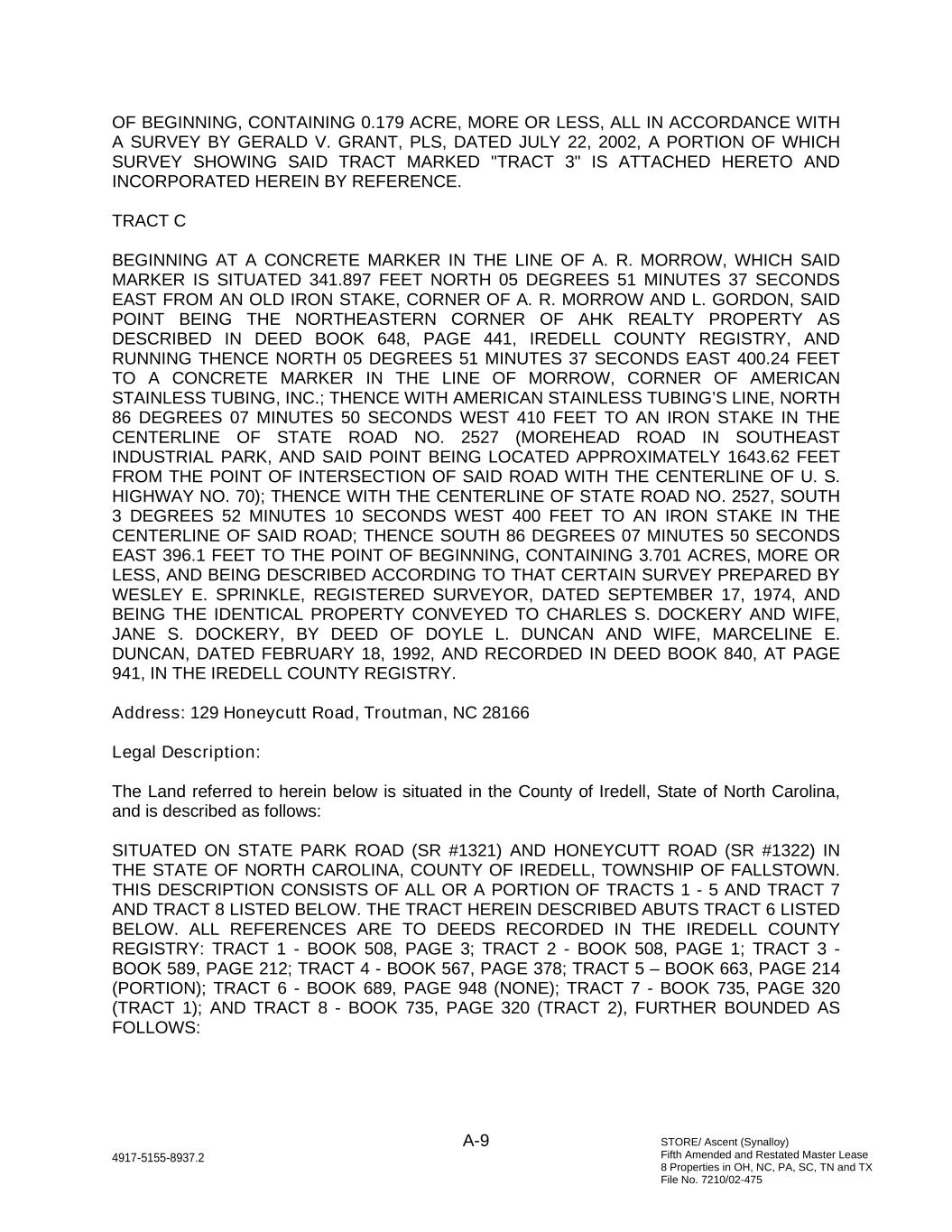 STORE/ Ascent (Synalloy) Fifth Amended and Restated Master Lease 8 Properties in OH, NC, PA, SC, TN and TX File No. 7210/02-475 A-9 4917-5155-8937.2 OF BEGINNING, CONTAINING 0.179 ACRE, MORE OR LESS, ALL IN ACCORDANCE WITH A SURVEY BY GERALD V. GRANT, PLS, DATED JULY 22, 2002, A PORTION OF WHICH SURVEY SHOWING SAID TRACT MARKED "TRACT 3" IS ATTACHED HERETO AND INCORPORATED HEREIN BY REFERENCE. TRACT C BEGINNING AT A CONCRETE MARKER IN THE LINE OF A. R. MORROW, WHICH SAID MARKER IS SITUATED 341.897 FEET NORTH 05 DEGREES 51 MINUTES 37 SECONDS EAST FROM AN OLD IRON STAKE, CORNER OF A. R. MORROW AND L. GORDON, SAID POINT BEING THE NORTHEASTERN CORNER OF AHK REALTY PROPERTY AS DESCRIBED IN DEED BOOK 648, PAGE 441, IREDELL COUNTY REGISTRY, AND RUNNING THENCE NORTH 05 DEGREES 51 MINUTES 37 SECONDS EAST 400.24 FEET TO A CONCRETE MARKER IN THE LINE OF MORROW, CORNER OF AMERICAN STAINLESS TUBING, INC.; THENCE WITH AMERICAN STAINLESS TUBING’S LINE, NORTH 86 DEGREES 07 MINUTES 50 SECONDS WEST 410 FEET TO AN IRON STAKE IN THE CENTERLINE OF STATE ROAD NO. 2527 (MOREHEAD ROAD IN SOUTHEAST INDUSTRIAL PARK, AND SAID POINT BEING LOCATED APPROXIMATELY 1643.62 FEET FROM THE POINT OF INTERSECTION OF SAID ROAD WITH THE CENTERLINE OF U. S. HIGHWAY NO. 70); THENCE WITH THE CENTERLINE OF STATE ROAD NO. 2527, SOUTH 3 DEGREES 52 MINUTES 10 SECONDS WEST 400 FEET TO AN IRON STAKE IN THE CENTERLINE OF SAID ROAD; THENCE SOUTH 86 DEGREES 07 MINUTES 50 SECONDS EAST 396.1 FEET TO THE POINT OF BEGINNING, CONTAINING 3.701 ACRES, MORE OR LESS, AND BEING DESCRIBED ACCORDING TO THAT CERTAIN SURVEY PREPARED BY WESLEY E. SPRINKLE, REGISTERED SURVEYOR, DATED SEPTEMBER 17, 1974, AND BEING THE IDENTICAL PROPERTY CONVEYED TO CHARLES S. DOCKERY AND WIFE, JANE S. DOCKERY, BY DEED OF DOYLE L. DUNCAN AND WIFE, MARCELINE E. DUNCAN, DATED FEBRUARY 18, 1992, AND RECORDED IN DEED BOOK 840, AT PAGE 941, IN THE IREDELL COUNTY REGISTRY. Address: 129 Honeycutt Road, Troutman, NC 28166 Legal Description: The Land referred to herein below is situated in the County of Iredell, State of North Carolina, and is described as follows: SITUATED ON STATE PARK ROAD (SR #1321) AND HONEYCUTT ROAD (SR #1322) IN THE STATE OF NORTH CAROLINA, COUNTY OF IREDELL, TOWNSHIP OF FALLSTOWN. THIS DESCRIPTION CONSISTS OF ALL OR A PORTION OF TRACTS 1 - 5 AND TRACT 7 AND TRACT 8 LISTED BELOW. THE TRACT HEREIN DESCRIBED ABUTS TRACT 6 LISTED BELOW. ALL REFERENCES ARE TO DEEDS RECORDED IN THE IREDELL COUNTY REGISTRY: TRACT 1 - BOOK 508, PAGE 3; TRACT 2 - BOOK 508, PAGE 1; TRACT 3 - BOOK 589, PAGE 212; TRACT 4 - BOOK 567, PAGE 378; TRACT 5 – BOOK 663, PAGE 214 (PORTION); TRACT 6 - BOOK 689, PAGE 948 (NONE); TRACT 7 - BOOK 735, PAGE 320 (TRACT 1); AND TRACT 8 - BOOK 735, PAGE 320 (TRACT 2), FURTHER BOUNDED AS FOLLOWS: