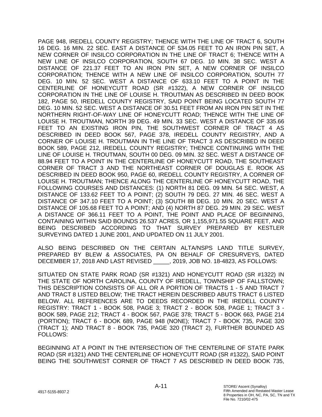 STORE/ Ascent (Synalloy) Fifth Amended and Restated Master Lease 8 Properties in OH, NC, PA, SC, TN and TX File No. 7210/02-475 A-11 4917-5155-8937.2 PAGE 948, IREDELL COUNTY REGISTRY; THENCE WITH THE LINE OF TRACT 6, SOUTH 16 DEG. 16 MIN. 22 SEC. EAST A DISTANCE OF 534.05 FEET TO AN IRON PIN SET, A NEW CORNER OF INSILCO CORPORATION IN THE LINE OF TRACT 6; THENCE WITH A NEW LINE OF INSILCO CORPORATION, SOUTH 67 DEG. 10 MIN. 38 SEC. WEST A DISTANCE OF 221.37 FEET TO AN IRON PIN SET, A NEW CORNER OF INSILCO CORPORATION; THENCE WITH A NEW LINE OF INSILCO CORPORATION, SOUTH 77 DEG. 10 MIN. 52 SEC. WEST A DISTANCE OF 633.10 FEET TO A POINT IN THE CENTERLINE OF HONEYCUTT ROAD (SR #1322), A NEW CORNER OF INSILCO CORPORATION IN THE LINE OF LOUISE H. TROUTMAN AS DESCRIBED IN DEED BOOK 182, PAGE 50, IREDELL COUNTY REGISTRY, SAID POINT BEING LOCATED SOUTH 77 DEG. 10 MIN. 52 SEC. WEST A DISTANCE OF 30.51 FEET FROM AN IRON PIN SET IN THE NORTHERN RIGHT-OF-WAY LINE OF HONEYCUTT ROAD; THENCE WITH THE LINE OF LOUISE H. TROUTMAN, NORTH 39 DEG. 49 MIN. 33 SEC. WEST A DISTANCE OF 335.66 FEET TO AN EXISTING IRON PIN, THE SOUTHWEST CORNER OF TRACT 4 AS DESCRIBED IN DEED BOOK 567, PAGE 378, IREDELL COUNTY REGISTRY, AND A CORNER OF LOUISE H. TROUTMAN IN THE LINE OF TRACT 3 AS DESCRIBED IN DEED BOOK 589, PAGE 212, IREDELL COUNTY REGISTRY; THENCE CONTINUING WITH THE LINE OF LOUISE H. TROUTMAN, SOUTH 00 DEG. 09 MIN. 32 SEC. WEST A DISTANCE OF 88.94 FEET TO A POINT IN THE CENTERLINE OF HONEYCUTT ROAD, THE SOUTHEAST CORNER OF TRACT 3 AND THE NORTHEAST CORNER OF DOUGLAS E. ROOK AS DESCRIBED IN DEED BOOK 950, PAGE 60, IREDELL COUNTY REGISTRY, A CORNER OF LOUISE H. TROUTMAN; THENCE ALONG THE CENTERLINE OF HONEYCUTT ROAD, THE FOLLOWING COURSES AND DISTANCES: (1) NORTH 81 DEG. 09 MIN. 54 SEC. WEST, A DISTANCE OF 133.62 FEET TO A POINT; (2) SOUTH 79 DEG. 27 MIN. 46 SEC. WEST A DISTANCE OF 347.10 FEET TO A POINT; (3) SOUTH 88 DEG. 10 MIN. 20 SEC. WEST A DISTANCE OF 105.68 FEET TO A POINT; AND (4) NORTH 87 DEG. 29 MIN. 29 SEC. WEST A DISTANCE OF 366.11 FEET TO A POINT, THE POINT AND PLACE OF BEGINNING, CONTAINING WITHIN SAID BOUNDS 26.537 ACRES, OR 1,155,971.55 SQUARE FEET, AND BEING DESCRIBED ACCORDING TO THAT SURVEY PREPARED BY KESTLER SURVEYING DATED 1 JUNE 2001, AND UPDATED ON 11 JULY 2001. ALSO BEING DESCRIBED ON THE CERTAIN ALTA/NSPS LAND TITLE SURVEY, PREPARED BY BLEW & ASSOCIATES, PA ON BEHALF OF CRESURVEYS, DATED DECEMBER 17, 2018 AND LAST REVISED _____, 2019, JOB NO. 18-4823, AS FOLLOWS: SITUATED ON STATE PARK ROAD (SR #1321) AND HONEYCUTT ROAD (SR #1322) IN THE STATE OF NORTH CAROLINA, COUNTY OF IREDELL, TOWNSHIP OF FALLSTOWN; THIS DESCRIPTION CONSISTS OF ALL OR A PORTION OF TRACTS 1 - 5 AND TRACT 7 AND TRACT 8 LISTED BELOW; THE TRACT HEREIN DESCRIBED ABUTS TRACT 6 LISTED BELOW. ALL REFERENCES ARE TO DEEDS RECORDED IN THE IREDELL COUNTY REGISTRY: TRACT 1 - BOOK 508, PAGE 3; TRACT 2 - BOOK 508, PAGE 1; TRACT 3 - BOOK 589, PAGE 212; TRACT 4 - BOOK 567, PAGE 378; TRACT 5 - BOOK 663, PAGE 214 (PORTION); TRACT 6 - BOOK 689, PAGE 948 (NONE); TRACT 7 - BOOK 735, PAGE 320 (TRACT 1); AND TRACT 8 - BOOK 735, PAGE 320 (TRACT 2), FURTHER BOUNDED AS FOLLOWS: BEGINNING AT A POINT IN THE INTERSECTION OF THE CENTERLINE OF STATE PARK ROAD (SR #1321) AND THE CENTERLINE OF HONEYCUTT ROAD (SR #1322), SAID POINT BEING THE SOUTHWEST CORNER OF TRACT 7 AS DESCRIBED IN DEED BOOK 735,