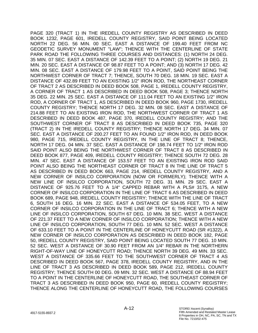STORE/ Ascent (Synalloy) Fifth Amended and Restated Master Lease 8 Properties in OH, NC, PA, SC, TN and TX File No. 7210/02-475 A-12 4917-5155-8937.2 PAGE 320 (TRACT 1) IN THE IREDELL COUNTY REGISTRY AS DESCRIBED IN DEED BOOK 1232, PAGE 601, IREDELL COUNTY REGISTRY, SAID POINT BEING LOCATED NORTH 22 DEG. 56 MIN. 00 SEC. EAST A DISTANCE OF 199.40 FEET FROM NC GEODETIC SURVEY MONUMENT "LAW"; THENCE WITH THE CENTERLINE OF STATE PARK ROAD THE FOLLOWING THREE COURSES AND DISTANCES: (1) NORTH 24 DEG. 35 MIN. 07 SEC. EAST A DISTANCE OF 142.39 FEET TO A POINT; (2) NORTH 19 DEG. 21 MIN. 20 SEC. EAST A DISTANCE OF 98.87 FEET TO A POINT; AND (3) NORTH 17 DEG. 42 MIN. 08 SEC. EAST A DISTANCE OF 179.98 FEET TO A POINT, SAID POINT BEING THE NORTHWEST CORNER OF TRACT 7; THENCE, SOUTH 70 DEG. 18 MIN. 19 SEC. EAST A DISTANCE OF 432.89 FEET TO AN EXISTING 1/2” IRON ROD, THE NORTHEAST CORNER OF TRACT 2 AS DESCRIBED IN DEED BOOK 508, PAGE 1, IREDELL COUNTY REGISTRY, A CORNER OF TRACT 1 AS DESCRIBED IN DEED BOOK 508, PAGE 3; THENCE NORTH 35 DEG. 22 MIN. 25 SEC. EAST A DISTANCE OF 111.04 FEET TO AN EXISTING 1/2” IRON ROD, A CORNER OF TRACT 1, AS DESCRIBED IN DEED BOOK 960, PAGE 1730, IREDELL COUNTY REGISTRY; THENCE NORTH 17 DEG. 32 MIN. 08 SEC. EAST A DISTANCE OF 214.88 FEET TO AN EXISTING IRON ROD, THE NORTHWEST CORNER OF TRACT 1 AS DESCRIBED IN DEED BOOK 487, PAGE 370, IREDELL COUNTY REGISTRY; AND THE SOUTHWEST CORNER OF TRACT 8 AS DESCRIBED IN DEED BOOK 735, PAGE 320 (TRACT 2) IN THE IREDELL COUNTY REGISTRY; THENCE NORTH 17 DEG. 34 MIN. 07 SEC. EAST A DISTANCE OF 200.27 FEET TO AN FOUND 1/2” IRON ROD, IN DEED BOOK 980, PAGE 715, IREDELL COUNTY REGISTRY, IN THE LINE OF TRACT 8; THENCE, NORTH 17 DEG. 04 MIN. 37 SEC. EAST A DISTANCE OF 198.74 FEET TO 1/2“ IRON ROD SAID POINT ALSO BEING THE NORTHWEST CORNER OF TRACT 8 AS DESCRIBED IN DEED BOOK 877, PAGE 409, IREDELL COUNTY REGISTRY; THENCE SOUTH 72 DEG. 28 MIN. 47 SEC. EAST A DISTANCE OF 153.57 FEET TO AN EXISTING IRON ROD SAID POINT ALSO BEING THE NORTHEAST CORNER OF TRACT 8 IN THE LINE OF TRACT 5 AS DESCRIBED IN DEED BOOK 663, PAGE 214, IREDELL COUNTY REGISTRY, AND A NEW CORNER OF INSILCO CORPORATION (NOW OR FORMERLY); THENCE WITH A NEW LINE OF INSILCO CORPORATION, SOUTH 72 DEG. 31 MIN. 29 SEC. EAST A DISTANCE OF 925.76 FEET TO A 1/4“ CAPPED REBAR WITH A PLS# 3175, A NEW CORNER OF INSILCO CORPORATION IN THE LINE OF TRACT 6 AS DESCRIBED IN DEED BOOK 689, PAGE 948, IREDELL COUNTY REGISTRY; THENCE WITH THE LINE OF TRACT 6, SOUTH 16 DEG. 16 MIN. 22 SEC. EAST A DISTANCE OF 534.05 FEET, TO A NEW CORNER OF INSILCO CORPORATION IN THE LINE OF TRACT 6; THENCE WITH A NEW LINE OF INSILCO CORPORATION, SOUTH 67 DEG. 10 MIN. 38 SEC. WEST A DISTANCE OF 221.37 FEET TO A NEW CORNER OF INSILCO CORPORATION; THENCE WITH A NEW LINE OF INSILCO CORPORATION, SOUTH 77 DEG. 10 MIN. 52 SEC. WEST A DISTANCE OF 633.10 FEET TO A POINT IN THE CENTERLINE OF HONEYCUTT ROAD (SR #1322), A NEW CORNER OF INSILCO CORPORATION AS DESCRIBED IN DEED BOOK 182, PAGE 50, IREDELL COUNTY REGISTRY, SAID POINT BEING LOCATED SOUTH 77 DEG. 10 MIN. 52 SEC. WEST A DISTANCE OF 30.90 FEET FROM AN 1/4“ REBAR IN THE NORTHERN RIGHT-OF-WAY LINE OF HONEYCUTT ROAD; THENCE NORTH 39 DEG. 49 MIN. 33 SEC. WEST A DISTANCE OF 335.66 FEET TO THE SOUTHWEST CORNER OF TRACT 4 AS DESCRIBED IN DEED BOOK 567, PAGE 378, IREDELL COUNTY REGISTRY, AND IN THE LINE OF TRACT 3 AS DESCRIBED IN DEED BOOK 589, PAGE 212, IREDELL COUNTY REGISTRY; THENCE SOUTH 00 DEG. 09 MIN. 32 SEC. WEST A DISTANCE OF 88.94 FEET TO A POINT IN THE CENTERLINE OF HONEYCUTT ROAD, THE SOUTHEAST CORNER OF TRACT 3 AS DESCRIBED IN DEED BOOK 950, PAGE 60, IREDELL COUNTY REGISTRY; THENCE ALONG THE CENTERLINE OF HONEYCUTT ROAD, THE FOLLOWING COURSES
