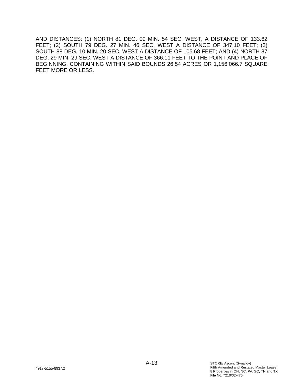 STORE/ Ascent (Synalloy) Fifth Amended and Restated Master Lease 8 Properties in OH, NC, PA, SC, TN and TX File No. 7210/02-475 A-13 4917-5155-8937.2 AND DISTANCES: (1) NORTH 81 DEG. 09 MIN. 54 SEC. WEST, A DISTANCE OF 133.62 FEET; (2) SOUTH 79 DEG. 27 MIN. 46 SEC. WEST A DISTANCE OF 347.10 FEET; (3) SOUTH 88 DEG. 10 MIN. 20 SEC. WEST A DISTANCE OF 105.68 FEET; AND (4) NORTH 87 DEG. 29 MIN. 29 SEC. WEST A DISTANCE OF 366.11 FEET TO THE POINT AND PLACE OF BEGINNING, CONTAINING WITHIN SAID BOUNDS 26.54 ACRES OR 1,156,066.7 SQUARE FEET MORE OR LESS.