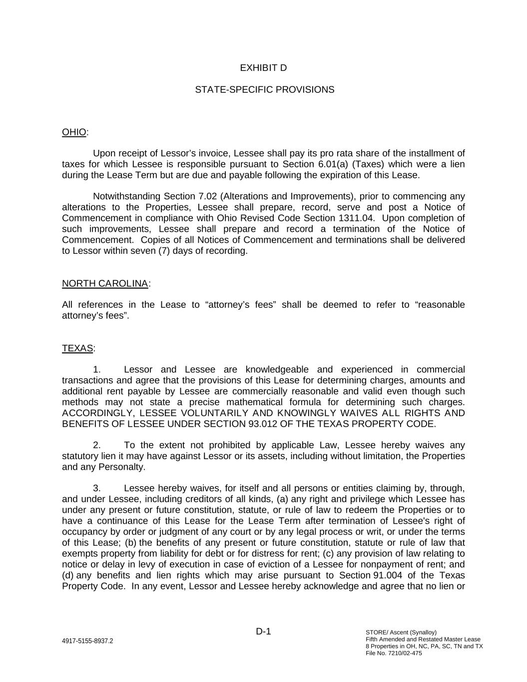 STORE/ Ascent (Synalloy) Fifth Amended and Restated Master Lease 8 Properties in OH, NC, PA, SC, TN and TX File No. 7210/02-475 D-1 4917-5155-8937.2 EXHIBIT D STATE-SPECIFIC PROVISIONS OHIO: Upon receipt of Lessor’s invoice, Lessee shall pay its pro rata share of the installment of taxes for which Lessee is responsible pursuant to Section 6.01(a) (Taxes) which were a lien during the Lease Term but are due and payable following the expiration of this Lease. Notwithstanding Section 7.02 (Alterations and Improvements), prior to commencing any alterations to the Properties, Lessee shall prepare, record, serve and post a Notice of Commencement in compliance with Ohio Revised Code Section 1311.04. Upon completion of such improvements, Lessee shall prepare and record a termination of the Notice of Commencement. Copies of all Notices of Commencement and terminations shall be delivered to Lessor within seven (7) days of recording. NORTH CAROLINA: All references in the Lease to “attorney’s fees” shall be deemed to refer to “reasonable attorney’s fees”. TEXAS: 1. Lessor and Lessee are knowledgeable and experienced in commercial transactions and agree that the provisions of this Lease for determining charges, amounts and additional rent payable by Lessee are commercially reasonable and valid even though such methods may not state a precise mathematical formula for determining such charges. ACCORDINGLY, LESSEE VOLUNTARILY AND KNOWINGLY WAIVES ALL RIGHTS AND BENEFITS OF LESSEE UNDER SECTION 93.012 OF THE TEXAS PROPERTY CODE. 2. To the extent not prohibited by applicable Law, Lessee hereby waives any statutory lien it may have against Lessor or its assets, including without limitation, the Properties and any Personalty. 3. Lessee hereby waives, for itself and all persons or entities claiming by, through, and under Lessee, including creditors of all kinds, (a) any right and privilege which Lessee has under any present or future constitution, statute, or rule of law to redeem the Properties or to have a continuance of this Lease for the Lease Term after termination of Lessee's right of occupancy by order or judgment of any court or by any legal process or writ, or under the terms of this Lease; (b) the benefits of any present or future constitution, statute or rule of law that exempts property from liability for debt or for distress for rent; (c) any provision of law relating to notice or delay in levy of execution in case of eviction of a Lessee for nonpayment of rent; and (d) any benefits and lien rights which may arise pursuant to Section 91.004 of the Texas Property Code. In any event, Lessor and Lessee hereby acknowledge and agree that no lien or