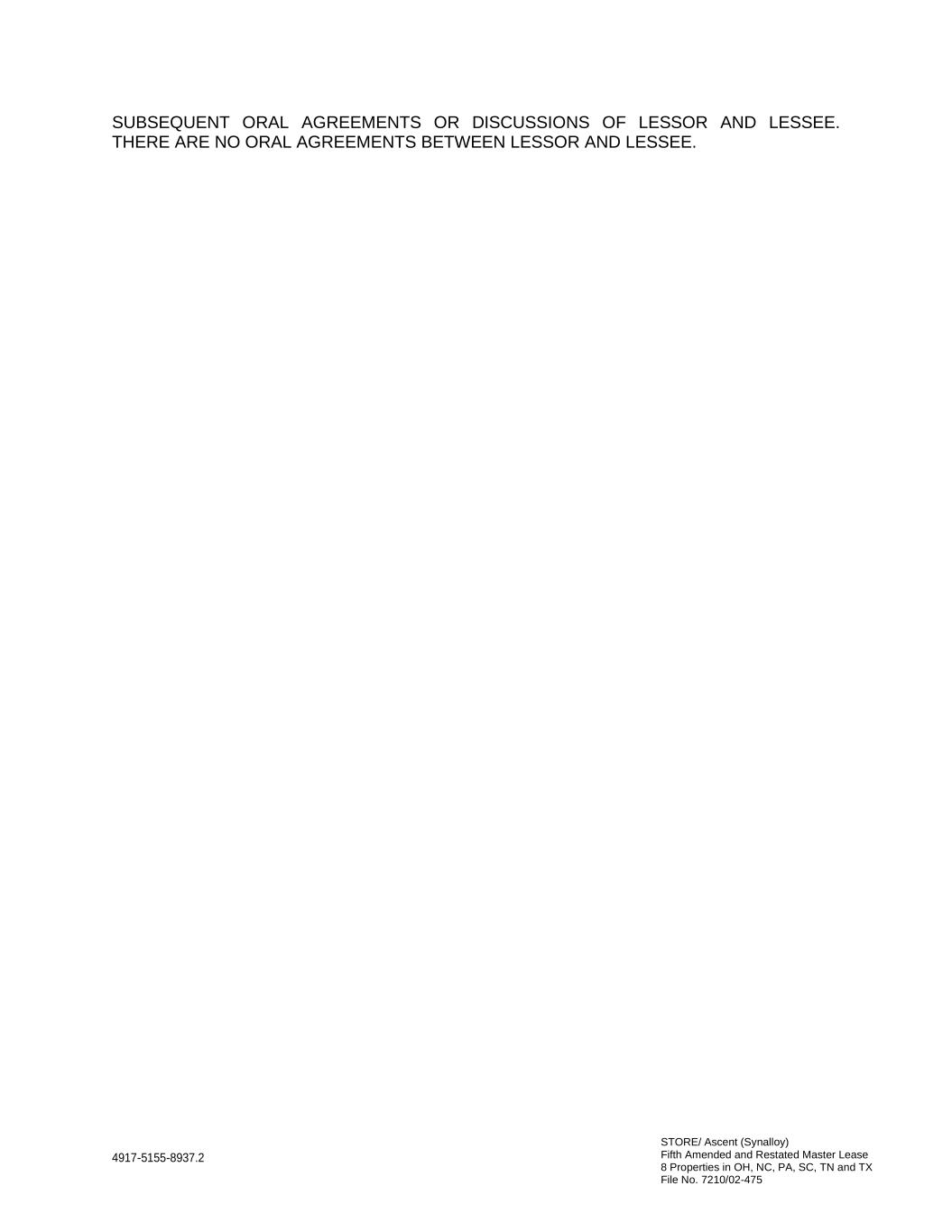 STORE/ Ascent (Synalloy) Fifth Amended and Restated Master Lease 8 Properties in OH, NC, PA, SC, TN and TX File No. 7210/02-475 4917-5155-8937.2 SUBSEQUENT ORAL AGREEMENTS OR DISCUSSIONS OF LESSOR AND LESSEE. THERE ARE NO ORAL AGREEMENTS BETWEEN LESSOR AND LESSEE.