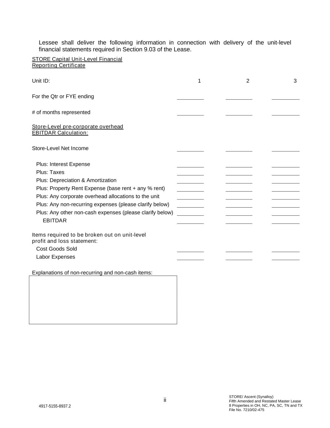 STORE/ Ascent (Synalloy) Fifth Amended and Restated Master Lease 8 Properties in OH, NC, PA, SC, TN and TX File No. 7210/02-475 ii 4917-5155-8937.2 Lessee shall deliver the following information in connection with delivery of the unit-level financial statements required in Section 9.03 of the Lease. STORE Capital Unit-Level Financial Reporting Certificate Unit ID: 1 2 3 For the Qtr or FYE ending # of months represented Store-Level pre-corporate overhead EBITDAR Calculation: Store-Level Net Income Plus: Interest Expense Plus: Taxes Plus: Depreciation & Amortization Plus: Property Rent Expense (base rent + any % rent) Plus: Any corporate overhead allocations to the unit Plus: Any non-recurring expenses (please clarify below) Plus: Any other non-cash expenses (please clarify below) EBITDAR Items required to be broken out on unit-level profit and loss statement: Cost Goods Sold Labor Expenses Explanations of non-recurring and non-cash items: