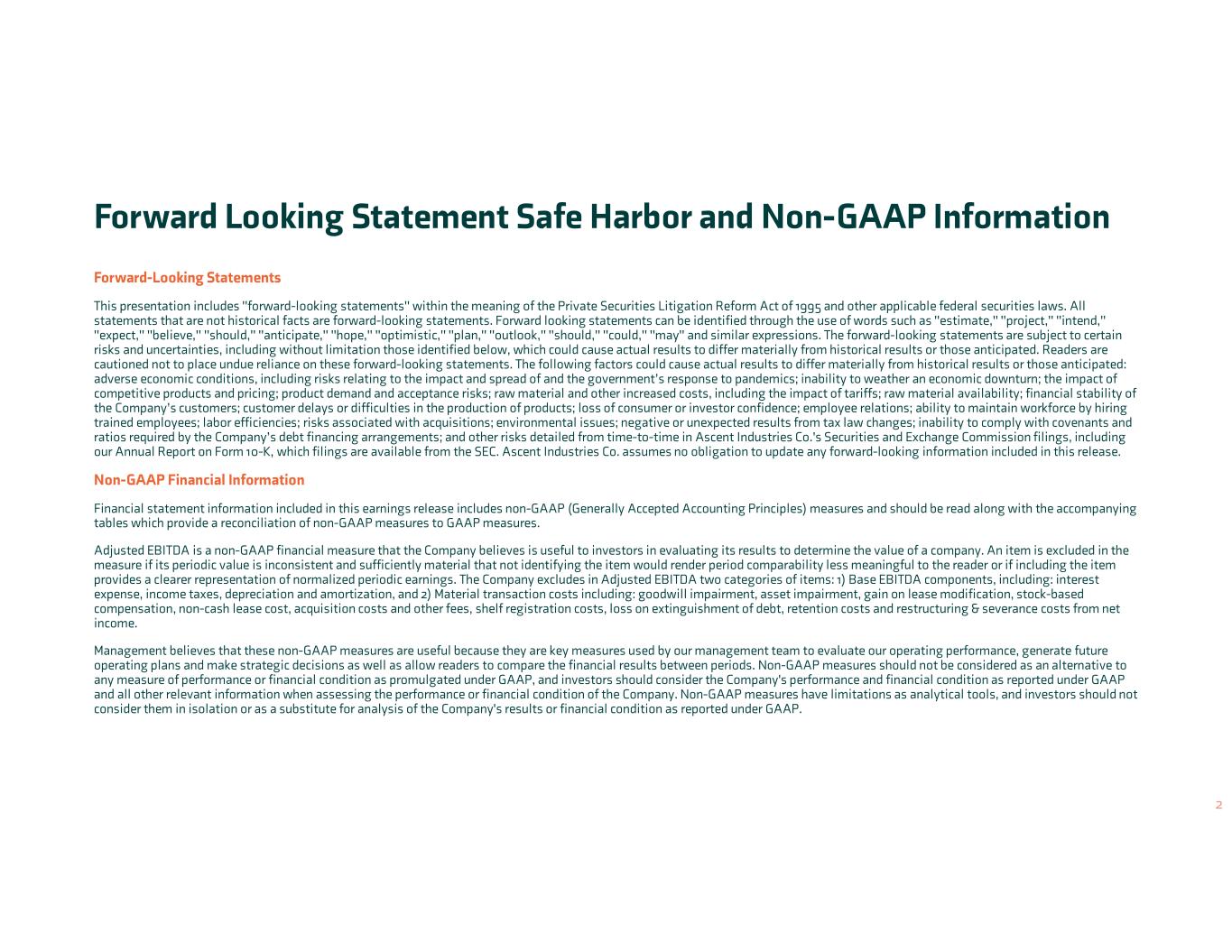 Forward-Looking Statements This presentation includes "forward-looking statements" within the meaning of the Private Securities Litigation Reform Act of 1995 and other applicable federal securities laws. All statements that are not historical facts are forward-looking statements. Forward looking statements can be identified through the use of words such as "estimate," "project," "intend," "expect," "believe," "should," "anticipate," "hope," "optimistic," "plan," "outlook," "should," "could," "may" and similar expressions. The forward-looking statements are subject to certain risks and uncertainties, including without limitation those identified below, which could cause actual results to differ materially from historical results or those anticipated. Readers are cautioned not to place undue reliance on these forward-looking statements. The following factors could cause actual results to differ materially from historical results or those anticipated: adverse economic conditions, including risks relating to the impact and spread of and the government’s response to pandemics; inability to weather an economic downturn; the impact of competitive products and pricing; product demand and acceptance risks; raw material and other increased costs, including the impact of tariffs; raw material availability; financial stability of the Company’s customers; customer delays or difficulties in the production of products; loss of consumer or investor confidence; employee relations; ability to maintain workforce by hiring trained employees; labor efficiencies; risks associated with acquisitions; environmental issues; negative or unexpected results from tax law changes; inability to comply with covenants and ratios required by the Company’s debt financing arrangements; and other risks detailed from time-to-time in Ascent Industries Co.'s Securities and Exchange Commission filings, including our Annual Report on Form 10-K, which filings are available from the SEC. Ascent Industries Co. assumes no obligation to update any forward-looking information included in this release. Non-GAAP Financial Information Financial statement information included in this earnings release includes non-GAAP (Generally Accepted Accounting Principles) measures and should be read along with the accompanying tables which provide a reconciliation of non-GAAP measures to GAAP measures. Adjusted EBITDA is a non-GAAP financial measure that the Company believes is useful to investors in evaluating its results to determine the value of a company. An item is excluded in the measure if its periodic value is inconsistent and sufficiently material that not identifying the item would render period comparability less meaningful to the reader or if including the item provides a clearer representation of normalized periodic earnings. The Company excludes in Adjusted EBITDA two categories of items: 1) Base EBITDA components, including: interest expense, income taxes, depreciation and amortization, and 2) Material transaction costs including: goodwill impairment, asset impairment, gain on lease modification, stock-based compensation, non-cash lease cost, acquisition costs and other fees, shelf registration costs, loss on extinguishment of debt, retention costs and restructuring & severance costs from net income. Management believes that these non-GAAP measures are useful because they are key measures used by our management team to evaluate our operating performance, generate future operating plans and make strategic decisions as well as allow readers to compare the financial results between periods. Non-GAAP measures should not be considered as an alternative to any measure of performance or financial condition as promulgated under GAAP, and investors should consider the Company's performance and financial condition as reported under GAAP and all other relevant information when assessing the performance or financial condition of the Company. Non-GAAP measures have limitations as analytical tools, and investors should not consider them in isolation or as a substitute for analysis of the Company's results or financial condition as reported under GAAP. Forward Looking Statement Safe Harbor and Non-GAAP Information 2
