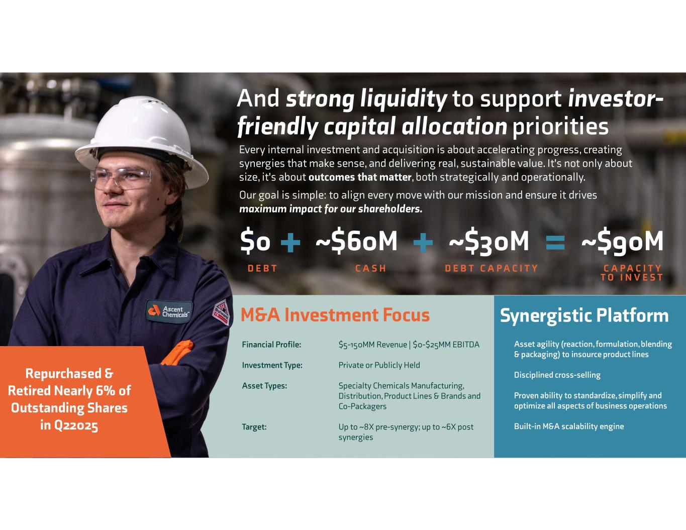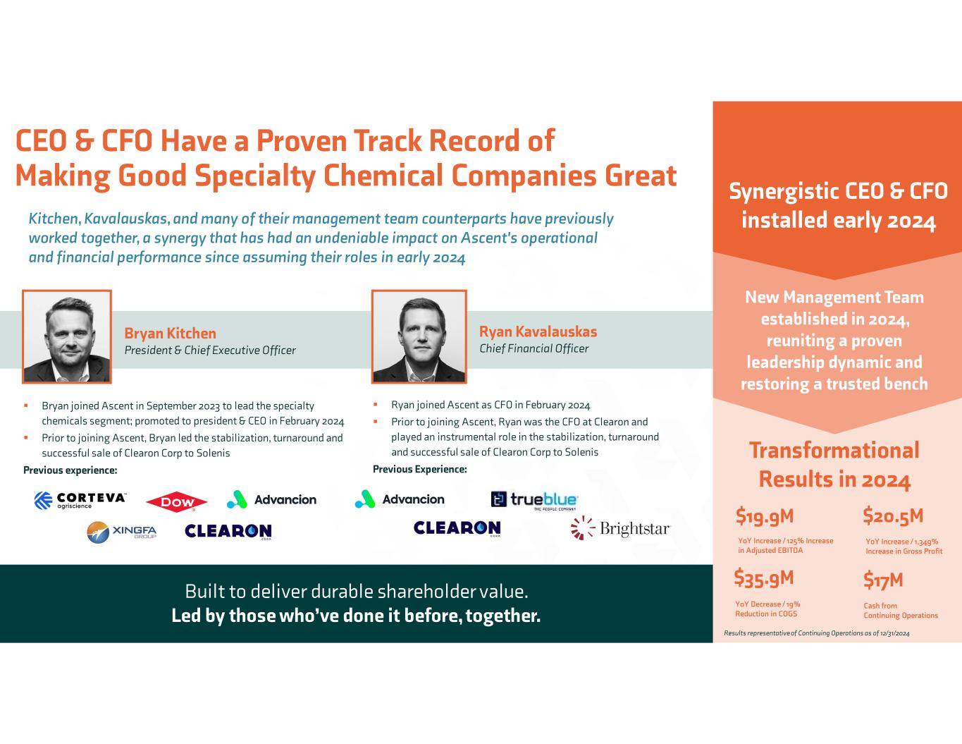 Kitchen, Kavalauskas, and many of their management team counterparts have previously worked together, a synergy that has had an undeniable impact on Ascent's operational and financial performance since assuming their roles in early 2024 CEO & CFO Have a Proven Track Record of Making Good Specialty Chemical Companies Great Bryan Kitchen President & Chief Executive Officer Bryan joined Ascent in September 2023 to lead the specialty chemicals segment; promoted to president & CEO in February 2024 Prior to joining Ascent, Bryan led the stabilization, turnaround and successful sale of Clearon Corp to Solenis Previous experience: Ryan Kavalauskas Chief Financial Officer Ryan joined Ascent as CFO in February 2024 Prior to joining Ascent, Ryan was the CFO at Clearon and played an instrumental role in the stabilization, turnaround and successful sale of Clearon Corp to Solenis Previous Experience: Built to deliver durable shareholder value. Led by those who’ve done it before, together. $19.9M YoY Increase / 125% Increase in Adjusted EBITDA $35.9M YoY Decrease / 19% Reduction in COGS $20.5M YoY Increase / 1,349% Increase in Gross Profit Transformational Results in 2024 $17M Cash from Continuing Operations Synergistic CEO & CFO installed early 2024 New Management Team established in 2024, reuniting a proven leadership dynamic and restoring a trusted bench Results representative of Continuing Operations as of 12/31/2024