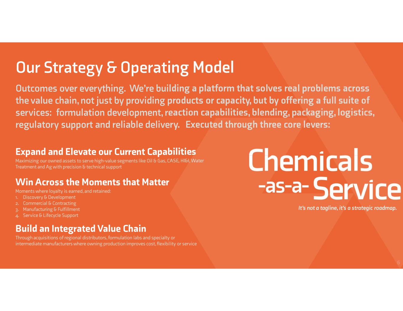 Expand and Elevate our Current Capabilities Maximizing our owned assets to serve high-value segments like Oil & Gas, CASE, HI&I, Water Treatment and Ag with precision & technical support Our Strategy & Operating Model Outcomes over everything. We’re building a platform that solves real problems across the value chain, not just by providing products or capacity, but by offering a full suite of services: formulation development, reaction capabilities, blending, packaging, logistics, regulatory support and reliable delivery. Executed through three core levers: 6 Build an Integrated Value Chain Through acquisitions of regional distributors, formulation labs and specialty or intermediate manufacturers where owning production improves cost, flexibility or service Win Across the Moments that Matter Moments where loyalty is earned, and retained: 1. Discovery & Development 2. Commercial & Contracting 3. Manufacturing & Fulfillment 4. Service & Lifecycle Support It’s not a tagline, it’s a strategic roadmap.