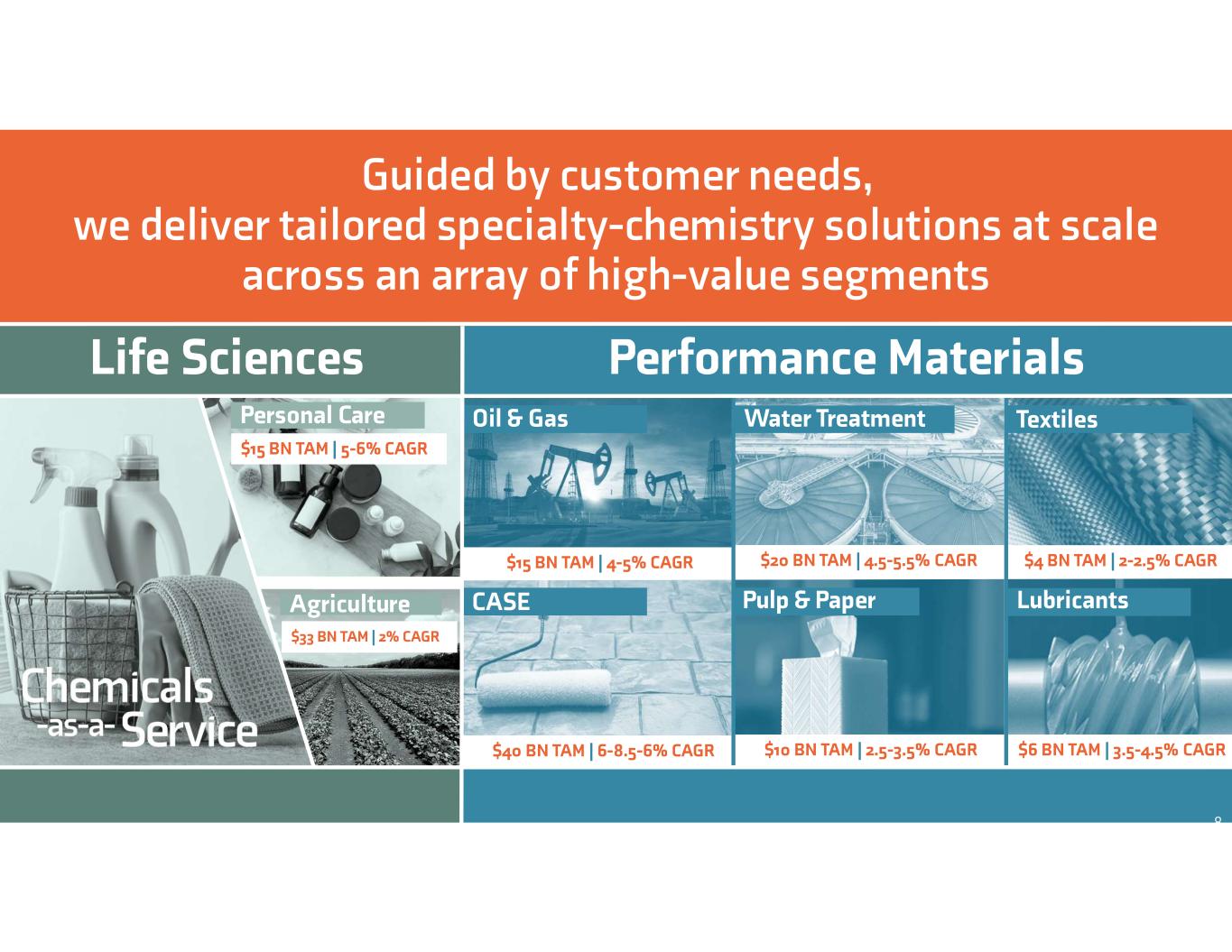Household, Industrial, and Institutional (HI&I) Cleaning $25 BN TAM | 4-5% CAGR $15 BN TAM | 4-5% CAGR Oil & Gas Water Treatment CASE Textiles LubricantsPulp & Paper $40 BN TAM | 6-8.5-6% CAGR $10 BN TAM | 2.5-3.5% CAGR $20 BN TAM | 4.5-5.5% CAGR $4 BN TAM | 2-2.5% CAGR $6 BN TAM | 3.5-4.5% CAGR Performance MaterialsLife Sciences Agriculture Personal Care $15 BN TAM | 5-6% CAGR $33 BN TAM | 2% CAGR Guided by customer needs, we deliver tailored specialty-chemistry solutions at scale across an array of high-value segments 8