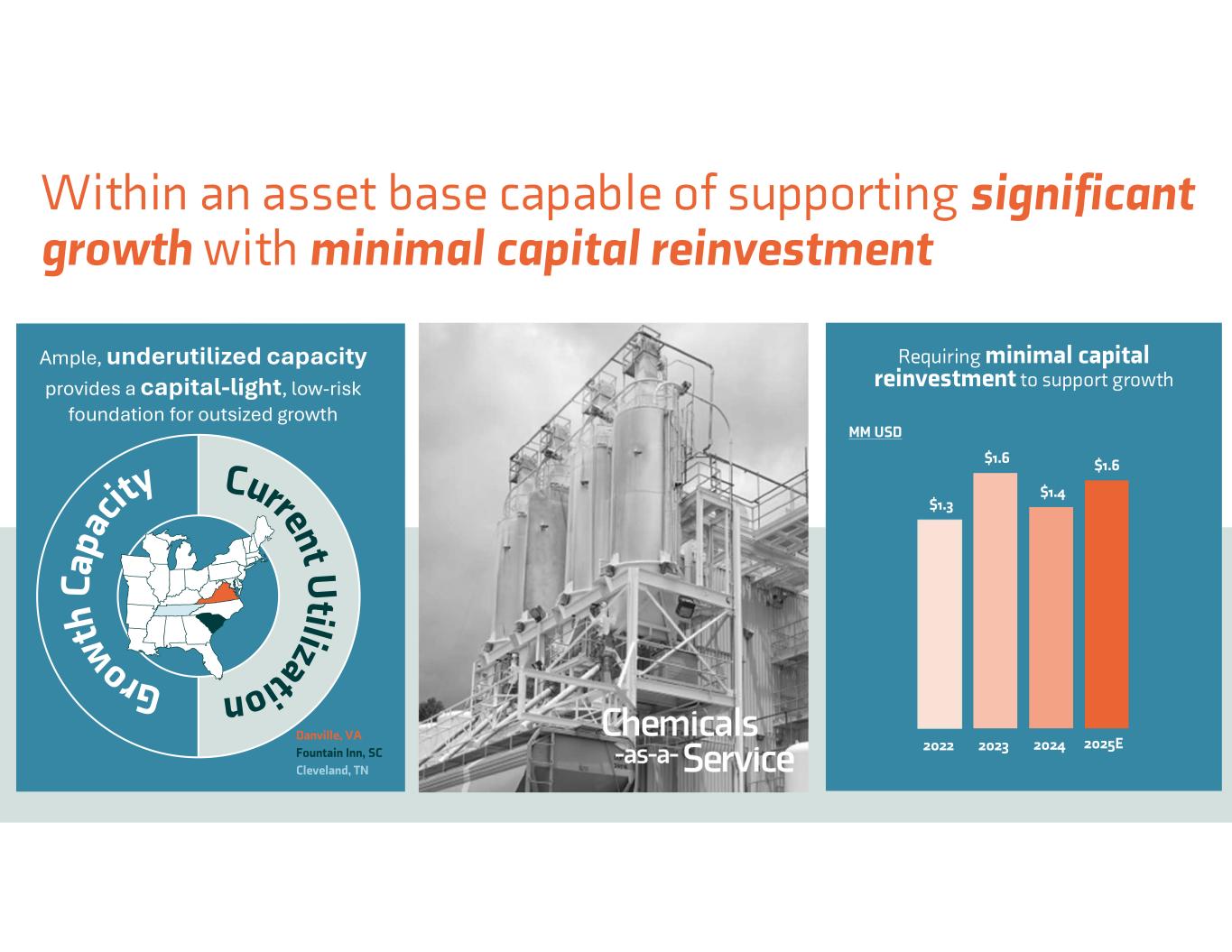 Ample, underutilized capacity provides a capital-light, low-risk foundation for outsized growth Requiring minimal capital reinvestment to support growth $1.3 $1.6 $1.4 $1.6 2022 2023 2024 Danville, VA Fountain Inn, SC Cleveland, TN MM USD 2025E Within an asset base capable of supporting significant growth with minimal capital reinvestment