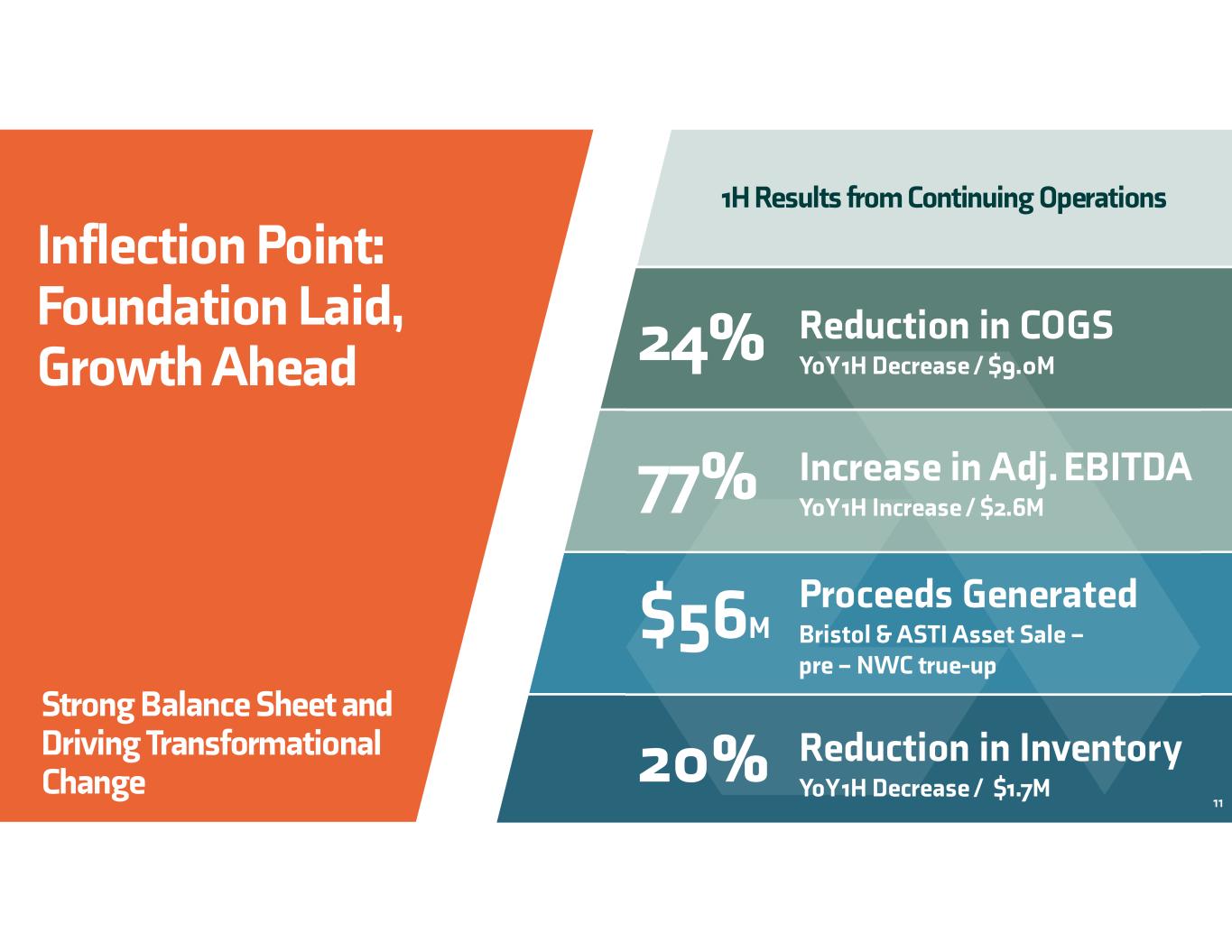 Inflection Point: Foundation Laid, Growth Ahead 24% Reduction in COGS YoY 1H Decrease / $9.0M 77% Increase in Adj. EBITDA YoY 1H Increase / $2.6M $56M Proceeds Generated Bristol & ASTI Asset Sale – pre – NWC true-up 20% Reduction in Inventory YoY 1H Decrease / $1.7M 1H Results from Continuing Operations 11 Strong Balance Sheet and Driving Transformational Change