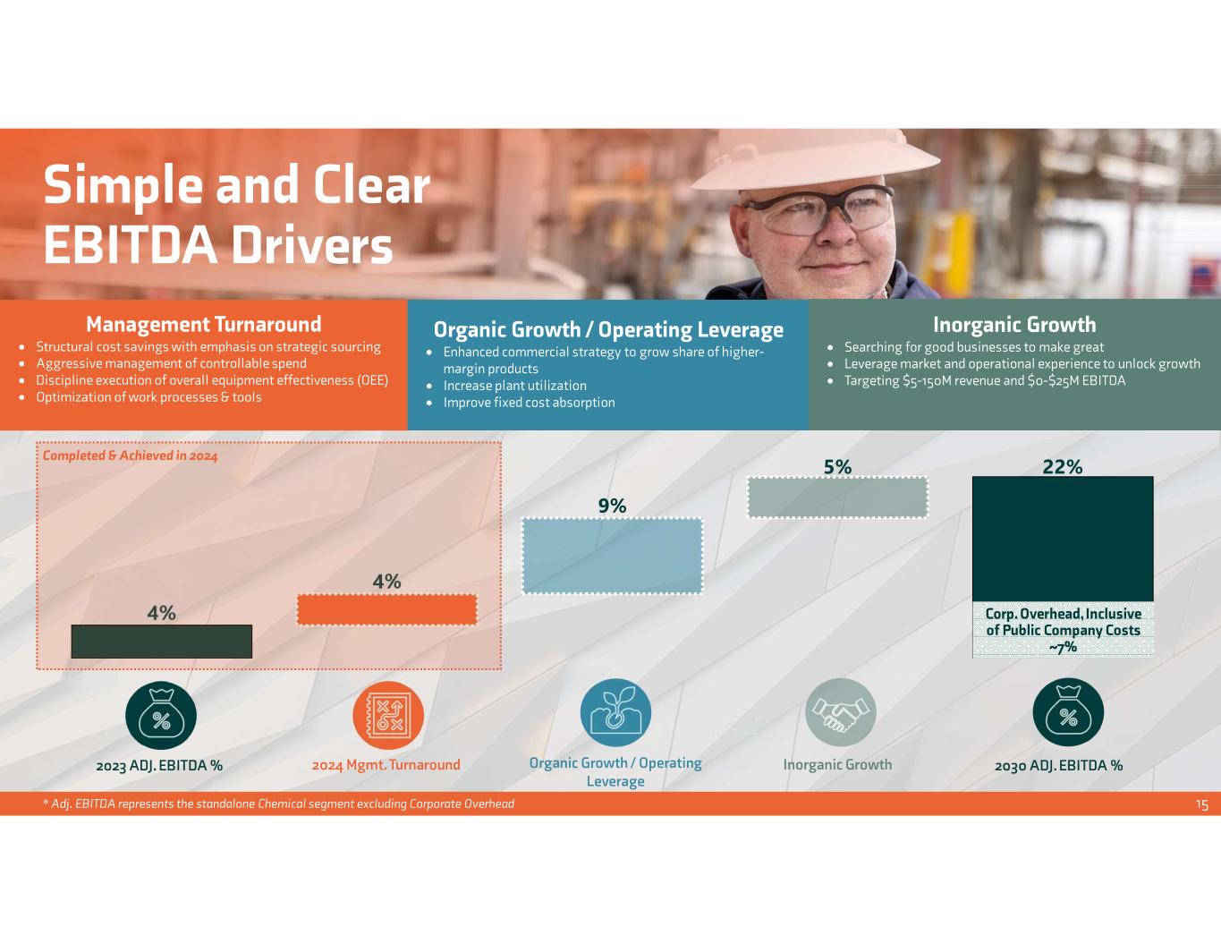 Simple and Clear EBITDA Drivers Management Turnaround Structural cost savings with emphasis on strategic sourcing Aggressive management of controllable spend Discipline execution of overall equipment effectiveness (OEE) Optimization of work processes & tools Organic Growth / Operating Leverage Enhanced commercial strategy to grow share of higher- margin products Increase plant utilization Improve fixed cost absorption 4% 4% 9% 5% 22% * Adj. EBITDA represents the standalone Chemical segment excluding Corporate Overhead 2023 ADJ. EBITDA % 2030 ADJ. EBITDA %2024 Mgmt. Turnaround Organic Growth / Operating Leverage Inorganic Growth Corp. Overhead, Inclusive of Public Company Costs ~7% 15 Completed & Achieved in 2024 Inorganic Growth Searching for good businesses to make great Leverage market and operational experience to unlock growth Targeting $5-150M revenue and $0-$25M EBITDA