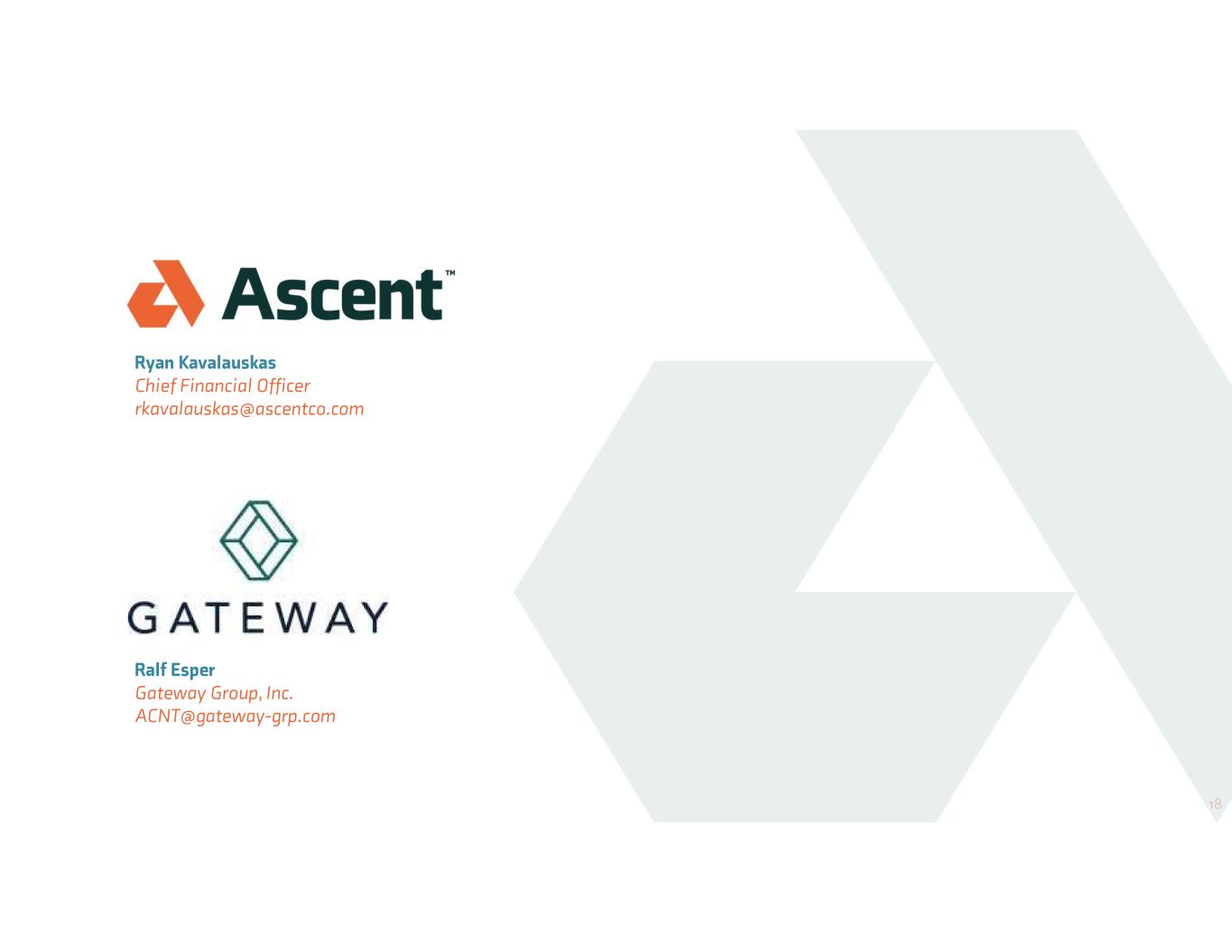 Ryan Kavalauskas Chief Financial Officer rkavalauskas@ascentco.com 18 Ralf Esper Gateway Group, Inc. ACNT@gateway-grp.com