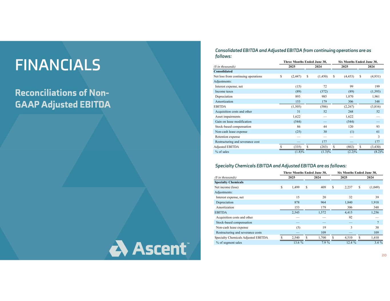 Reconciliations of Non- GAAP Adjusted EBITDA FINANCIALS Three Months Ended June 30, Six Months Ended June 30, ($ in thousands) 2025 2024 2025 2024 Consolidated Net loss from continuing operations $ (2,447) $ (1,450) $ (4,453) $ (4,931) Adjustments: Interest expense, net (15) 72 99 199 Income taxes (89) (372) (89) (1,393) Depreciation 893 985 1,870 1,961 Amortization 153 179 306 348 EBITDA (1,505) (586) (2,267) (3,816) Acquisition costs and other 31 52 268 52 Asset impairments 1,622 — 1,622 — Gain on lease modification (544) — (544) — Stock-based compensation 86 44 120 93 Non-cash lease expense (25) 30 (1) 61 Retention expense — — — 3 Restructuring and severance cost — 177 — 177 Adjusted EBITDA $ (335) $ (283) $ (802) $ (3,430) % of sales (1.8) % (1.3) % (2.2) % (8.2) % Three Months Ended June 30, Six Months Ended June 30, ($ in thousands) 2025 2024 2025 2024 Specialty Chemicals Net income (loss) $ 1,499 $ 409 $ 2,237 $ (1,049) Adjustments: Interest expense, net 15 20 32 39 Depreciation 878 964 1,840 1,918 Amortization 153 179 306 348 EBITDA 2,545 1,572 4,415 1,256 Acquisition costs and other — — 92 — Stock-based compensation — — — 7 Non-cash lease expense (5) 19 3 38 Restructuring and severance costs — 109 — 109 Specialty Chemicals Adjusted EBITDA $ 2,540 $ 1,700 $ 4,510 $ 1,410 % of segment sales 13.6 % 7.9 % 12.4 % 3.4 % Consolidated EBITDA and Adjusted EBITDA from continuing operations are as follows: Specialty Chemicals EBITDA and Adjusted EBITDA are as follows: 20