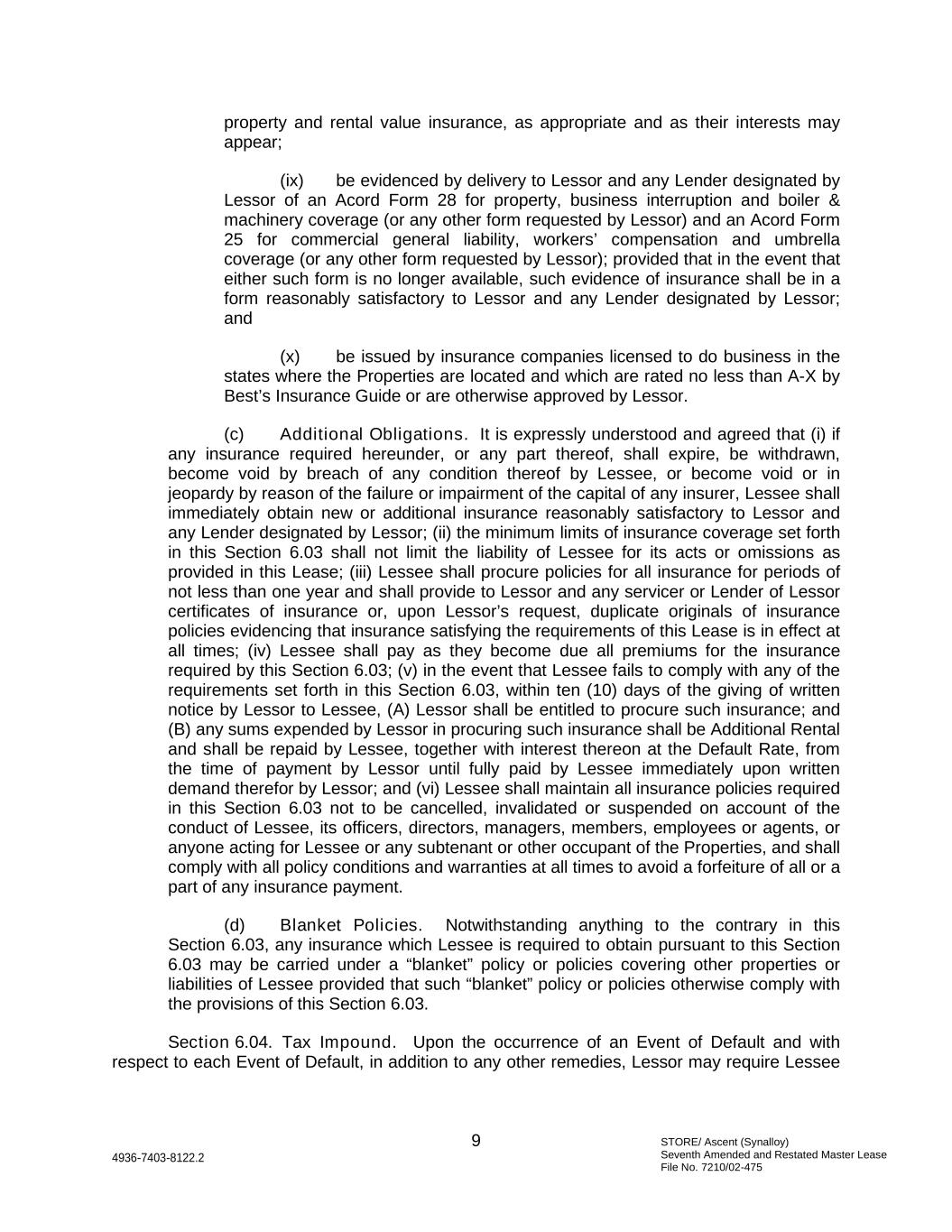 STORE/ Ascent (Synalloy) Seventh Amended and Restated Master Lease File No. 7210/02-475 9 4936-7403-8122.2 property and rental value insurance, as appropriate and as their interests may appear; (ix) be evidenced by delivery to Lessor and any Lender designated by Lessor of an Acord Form 28 for property, business interruption and boiler & machinery coverage (or any other form requested by Lessor) and an Acord Form 25 for commercial general liability, workers’ compensation and umbrella coverage (or any other form requested by Lessor); provided that in the event that either such form is no longer available, such evidence of insurance shall be in a form reasonably satisfactory to Lessor and any Lender designated by Lessor; and (x) be issued by insurance companies licensed to do business in the states where the Properties are located and which are rated no less than A-X by Best’s Insurance Guide or are otherwise approved by Lessor. (c) Additional Obligations. It is expressly understood and agreed that (i) if any insurance required hereunder, or any part thereof, shall expire, be withdrawn, become void by breach of any condition thereof by Lessee, or become void or in jeopardy by reason of the failure or impairment of the capital of any insurer, Lessee shall immediately obtain new or additional insurance reasonably satisfactory to Lessor and any Lender designated by Lessor; (ii) the minimum limits of insurance coverage set forth in this Section 6.03 shall not limit the liability of Lessee for its acts or omissions as provided in this Lease; (iii) Lessee shall procure policies for all insurance for periods of not less than one year and shall provide to Lessor and any servicer or Lender of Lessor certificates of insurance or, upon Lessor’s request, duplicate originals of insurance policies evidencing that insurance satisfying the requirements of this Lease is in effect at all times; (iv) Lessee shall pay as they become due all premiums for the insurance required by this Section 6.03; (v) in the event that Lessee fails to comply with any of the requirements set forth in this Section 6.03, within ten (10) days of the giving of written notice by Lessor to Lessee, (A) Lessor shall be entitled to procure such insurance; and (B) any sums expended by Lessor in procuring such insurance shall be Additional Rental and shall be repaid by Lessee, together with interest thereon at the Default Rate, from the time of payment by Lessor until fully paid by Lessee immediately upon written demand therefor by Lessor; and (vi) Lessee shall maintain all insurance policies required in this Section 6.03 not to be cancelled, invalidated or suspended on account of the conduct of Lessee, its officers, directors, managers, members, employees or agents, or anyone acting for Lessee or any subtenant or other occupant of the Properties, and shall comply with all policy conditions and warranties at all times to avoid a forfeiture of all or a part of any insurance payment. (d) Blanket Policies. Notwithstanding anything to the contrary in this Section 6.03, any insurance which Lessee is required to obtain pursuant to this Section 6.03 may be carried under a “blanket” policy or policies covering other properties or liabilities of Lessee provided that such “blanket” policy or policies otherwise comply with the provisions of this Section 6.03. Section 6.04. Tax Impound. Upon the occurrence of an Event of Default and with respect to each Event of Default, in addition to any other remedies, Lessor may require Lessee