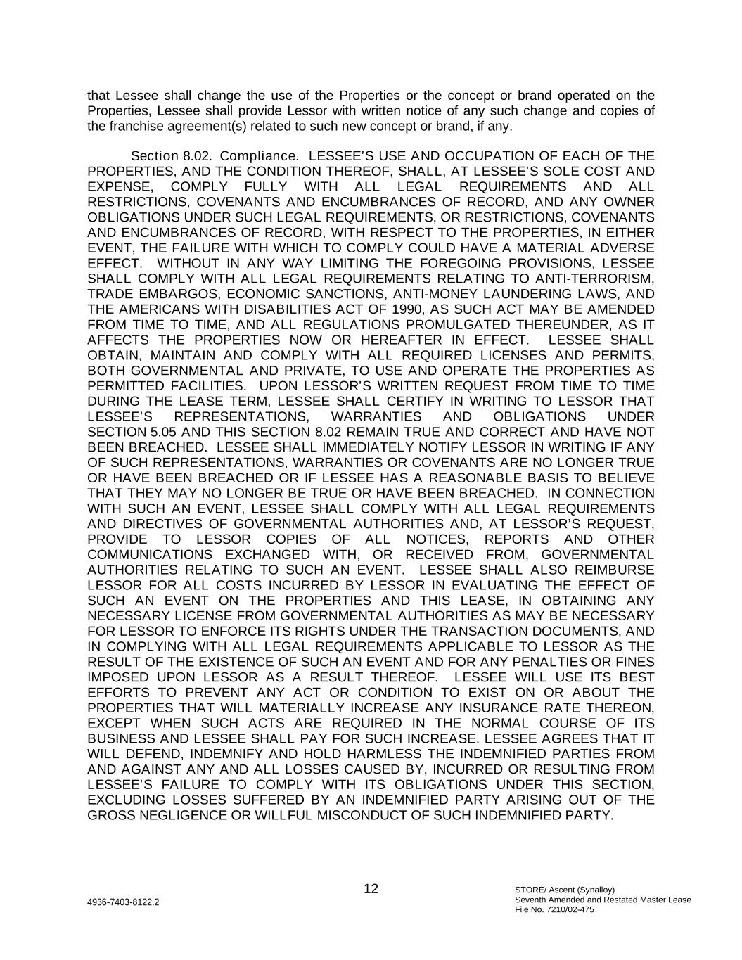 STORE/ Ascent (Synalloy) Seventh Amended and Restated Master Lease File No. 7210/02-475 12 4936-7403-8122.2 that Lessee shall change the use of the Properties or the concept or brand operated on the Properties, Lessee shall provide Lessor with written notice of any such change and copies of the franchise agreement(s) related to such new concept or brand, if any. Section 8.02. Compliance. LESSEE’S USE AND OCCUPATION OF EACH OF THE PROPERTIES, AND THE CONDITION THEREOF, SHALL, AT LESSEE’S SOLE COST AND EXPENSE, COMPLY FULLY WITH ALL LEGAL REQUIREMENTS AND ALL RESTRICTIONS, COVENANTS AND ENCUMBRANCES OF RECORD, AND ANY OWNER OBLIGATIONS UNDER SUCH LEGAL REQUIREMENTS, OR RESTRICTIONS, COVENANTS AND ENCUMBRANCES OF RECORD, WITH RESPECT TO THE PROPERTIES, IN EITHER EVENT, THE FAILURE WITH WHICH TO COMPLY COULD HAVE A MATERIAL ADVERSE EFFECT. WITHOUT IN ANY WAY LIMITING THE FOREGOING PROVISIONS, LESSEE SHALL COMPLY WITH ALL LEGAL REQUIREMENTS RELATING TO ANTI-TERRORISM, TRADE EMBARGOS, ECONOMIC SANCTIONS, ANTI-MONEY LAUNDERING LAWS, AND THE AMERICANS WITH DISABILITIES ACT OF 1990, AS SUCH ACT MAY BE AMENDED FROM TIME TO TIME, AND ALL REGULATIONS PROMULGATED THEREUNDER, AS IT AFFECTS THE PROPERTIES NOW OR HEREAFTER IN EFFECT. LESSEE SHALL OBTAIN, MAINTAIN AND COMPLY WITH ALL REQUIRED LICENSES AND PERMITS, BOTH GOVERNMENTAL AND PRIVATE, TO USE AND OPERATE THE PROPERTIES AS PERMITTED FACILITIES. UPON LESSOR’S WRITTEN REQUEST FROM TIME TO TIME DURING THE LEASE TERM, LESSEE SHALL CERTIFY IN WRITING TO LESSOR THAT LESSEE’S REPRESENTATIONS, WARRANTIES AND OBLIGATIONS UNDER SECTION 5.05 AND THIS SECTION 8.02 REMAIN TRUE AND CORRECT AND HAVE NOT BEEN BREACHED. LESSEE SHALL IMMEDIATELY NOTIFY LESSOR IN WRITING IF ANY OF SUCH REPRESENTATIONS, WARRANTIES OR COVENANTS ARE NO LONGER TRUE OR HAVE BEEN BREACHED OR IF LESSEE HAS A REASONABLE BASIS TO BELIEVE THAT THEY MAY NO LONGER BE TRUE OR HAVE BEEN BREACHED. IN CONNECTION WITH SUCH AN EVENT, LESSEE SHALL COMPLY WITH ALL LEGAL REQUIREMENTS AND DIRECTIVES OF GOVERNMENTAL AUTHORITIES AND, AT LESSOR’S REQUEST, PROVIDE TO LESSOR COPIES OF ALL NOTICES, REPORTS AND OTHER COMMUNICATIONS EXCHANGED WITH, OR RECEIVED FROM, GOVERNMENTAL AUTHORITIES RELATING TO SUCH AN EVENT. LESSEE SHALL ALSO REIMBURSE LESSOR FOR ALL COSTS INCURRED BY LESSOR IN EVALUATING THE EFFECT OF SUCH AN EVENT ON THE PROPERTIES AND THIS LEASE, IN OBTAINING ANY NECESSARY LICENSE FROM GOVERNMENTAL AUTHORITIES AS MAY BE NECESSARY FOR LESSOR TO ENFORCE ITS RIGHTS UNDER THE TRANSACTION DOCUMENTS, AND IN COMPLYING WITH ALL LEGAL REQUIREMENTS APPLICABLE TO LESSOR AS THE RESULT OF THE EXISTENCE OF SUCH AN EVENT AND FOR ANY PENALTIES OR FINES IMPOSED UPON LESSOR AS A RESULT THEREOF. LESSEE WILL USE ITS BEST EFFORTS TO PREVENT ANY ACT OR CONDITION TO EXIST ON OR ABOUT THE PROPERTIES THAT WILL MATERIALLY INCREASE ANY INSURANCE RATE THEREON, EXCEPT WHEN SUCH ACTS ARE REQUIRED IN THE NORMAL COURSE OF ITS BUSINESS AND LESSEE SHALL PAY FOR SUCH INCREASE. LESSEE AGREES THAT IT WILL DEFEND, INDEMNIFY AND HOLD HARMLESS THE INDEMNIFIED PARTIES FROM AND AGAINST ANY AND ALL LOSSES CAUSED BY, INCURRED OR RESULTING FROM LESSEE’S FAILURE TO COMPLY WITH ITS OBLIGATIONS UNDER THIS SECTION, EXCLUDING LOSSES SUFFERED BY AN INDEMNIFIED PARTY ARISING OUT OF THE GROSS NEGLIGENCE OR WILLFUL MISCONDUCT OF SUCH INDEMNIFIED PARTY.