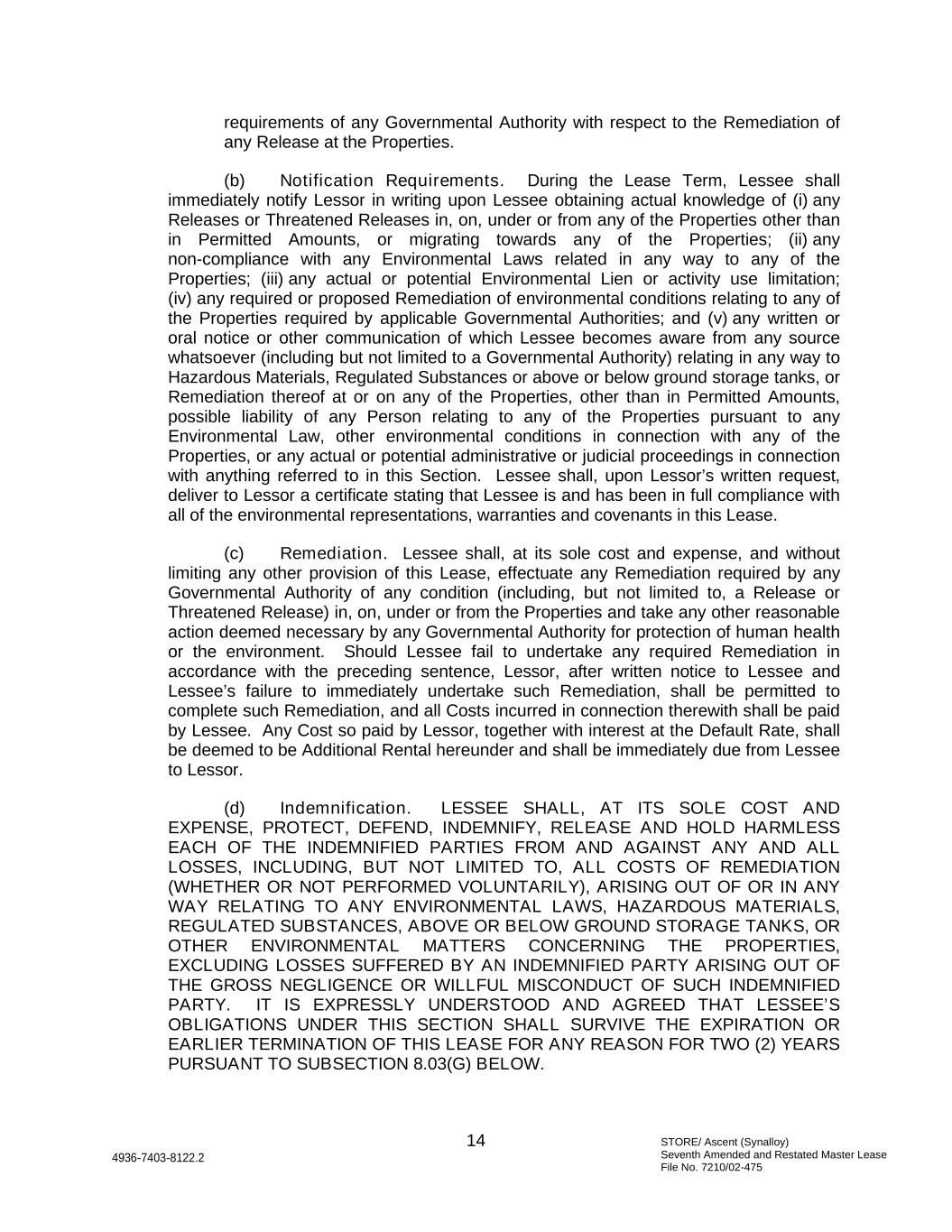 STORE/ Ascent (Synalloy) Seventh Amended and Restated Master Lease File No. 7210/02-475 14 4936-7403-8122.2 requirements of any Governmental Authority with respect to the Remediation of any Release at the Properties. (b) Notification Requirements. During the Lease Term, Lessee shall immediately notify Lessor in writing upon Lessee obtaining actual knowledge of (i) any Releases or Threatened Releases in, on, under or from any of the Properties other than in Permitted Amounts, or migrating towards any of the Properties; (ii) any non-compliance with any Environmental Laws related in any way to any of the Properties; (iii) any actual or potential Environmental Lien or activity use limitation; (iv) any required or proposed Remediation of environmental conditions relating to any of the Properties required by applicable Governmental Authorities; and (v) any written or oral notice or other communication of which Lessee becomes aware from any source whatsoever (including but not limited to a Governmental Authority) relating in any way to Hazardous Materials, Regulated Substances or above or below ground storage tanks, or Remediation thereof at or on any of the Properties, other than in Permitted Amounts, possible liability of any Person relating to any of the Properties pursuant to any Environmental Law, other environmental conditions in connection with any of the Properties, or any actual or potential administrative or judicial proceedings in connection with anything referred to in this Section. Lessee shall, upon Lessor’s written request, deliver to Lessor a certificate stating that Lessee is and has been in full compliance with all of the environmental representations, warranties and covenants in this Lease. (c) Remediation. Lessee shall, at its sole cost and expense, and without limiting any other provision of this Lease, effectuate any Remediation required by any Governmental Authority of any condition (including, but not limited to, a Release or Threatened Release) in, on, under or from the Properties and take any other reasonable action deemed necessary by any Governmental Authority for protection of human health or the environment. Should Lessee fail to undertake any required Remediation in accordance with the preceding sentence, Lessor, after written notice to Lessee and Lessee’s failure to immediately undertake such Remediation, shall be permitted to complete such Remediation, and all Costs incurred in connection therewith shall be paid by Lessee. Any Cost so paid by Lessor, together with interest at the Default Rate, shall be deemed to be Additional Rental hereunder and shall be immediately due from Lessee to Lessor. (d) Indemnification. LESSEE SHALL, AT ITS SOLE COST AND EXPENSE, PROTECT, DEFEND, INDEMNIFY, RELEASE AND HOLD HARMLESS EACH OF THE INDEMNIFIED PARTIES FROM AND AGAINST ANY AND ALL LOSSES, INCLUDING, BUT NOT LIMITED TO, ALL COSTS OF REMEDIATION (WHETHER OR NOT PERFORMED VOLUNTARILY), ARISING OUT OF OR IN ANY WAY RELATING TO ANY ENVIRONMENTAL LAWS, HAZARDOUS MATERIALS, REGULATED SUBSTANCES, ABOVE OR BELOW GROUND STORAGE TANKS, OR OTHER ENVIRONMENTAL MATTERS CONCERNING THE PROPERTIES, EXCLUDING LOSSES SUFFERED BY AN INDEMNIFIED PARTY ARISING OUT OF THE GROSS NEGLIGENCE OR WILLFUL MISCONDUCT OF SUCH INDEMNIFIED PARTY. IT IS EXPRESSLY UNDERSTOOD AND AGREED THAT LESSEE’S OBLIGATIONS UNDER THIS SECTION SHALL SURVIVE THE EXPIRATION OR EARLIER TERMINATION OF THIS LEASE FOR ANY REASON FOR TWO (2) YEARS PURSUANT TO SUBSECTION 8.03(G) BELOW.