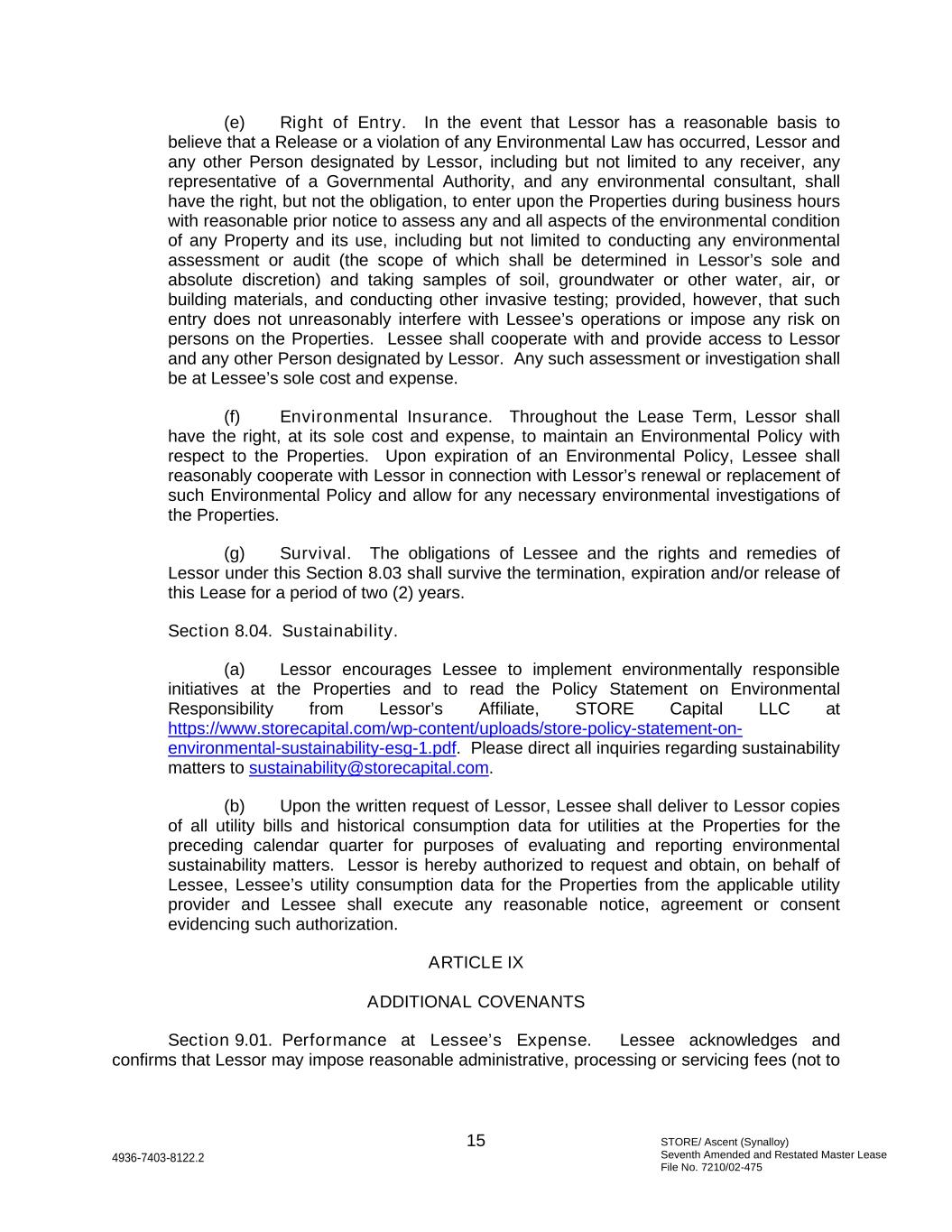 STORE/ Ascent (Synalloy) Seventh Amended and Restated Master Lease File No. 7210/02-475 15 4936-7403-8122.2 (e) Right of Entry. In the event that Lessor has a reasonable basis to believe that a Release or a violation of any Environmental Law has occurred, Lessor and any other Person designated by Lessor, including but not limited to any receiver, any representative of a Governmental Authority, and any environmental consultant, shall have the right, but not the obligation, to enter upon the Properties during business hours with reasonable prior notice to assess any and all aspects of the environmental condition of any Property and its use, including but not limited to conducting any environmental assessment or audit (the scope of which shall be determined in Lessor’s sole and absolute discretion) and taking samples of soil, groundwater or other water, air, or building materials, and conducting other invasive testing; provided, however, that such entry does not unreasonably interfere with Lessee’s operations or impose any risk on persons on the Properties. Lessee shall cooperate with and provide access to Lessor and any other Person designated by Lessor. Any such assessment or investigation shall be at Lessee’s sole cost and expense. (f) Environmental Insurance. Throughout the Lease Term, Lessor shall have the right, at its sole cost and expense, to maintain an Environmental Policy with respect to the Properties. Upon expiration of an Environmental Policy, Lessee shall reasonably cooperate with Lessor in connection with Lessor’s renewal or replacement of such Environmental Policy and allow for any necessary environmental investigations of the Properties. (g) Survival. The obligations of Lessee and the rights and remedies of Lessor under this Section 8.03 shall survive the termination, expiration and/or release of this Lease for a period of two (2) years. Section 8.04. Sustainability. (a) Lessor encourages Lessee to implement environmentally responsible initiatives at the Properties and to read the Policy Statement on Environmental Responsibility from Lessor’s Affiliate, STORE Capital LLC at https://www.storecapital.com/wp-content/uploads/store-policy-statement-on- environmental-sustainability-esg-1.pdf. Please direct all inquiries regarding sustainability matters to sustainability@storecapital.com. (b) Upon the written request of Lessor, Lessee shall deliver to Lessor copies of all utility bills and historical consumption data for utilities at the Properties for the preceding calendar quarter for purposes of evaluating and reporting environmental sustainability matters. Lessor is hereby authorized to request and obtain, on behalf of Lessee, Lessee’s utility consumption data for the Properties from the applicable utility provider and Lessee shall execute any reasonable notice, agreement or consent evidencing such authorization. ARTICLE IX ADDITIONAL COVENANTS Section 9.01. Performance at Lessee’s Expense. Lessee acknowledges and confirms that Lessor may impose reasonable administrative, processing or servicing fees (not to