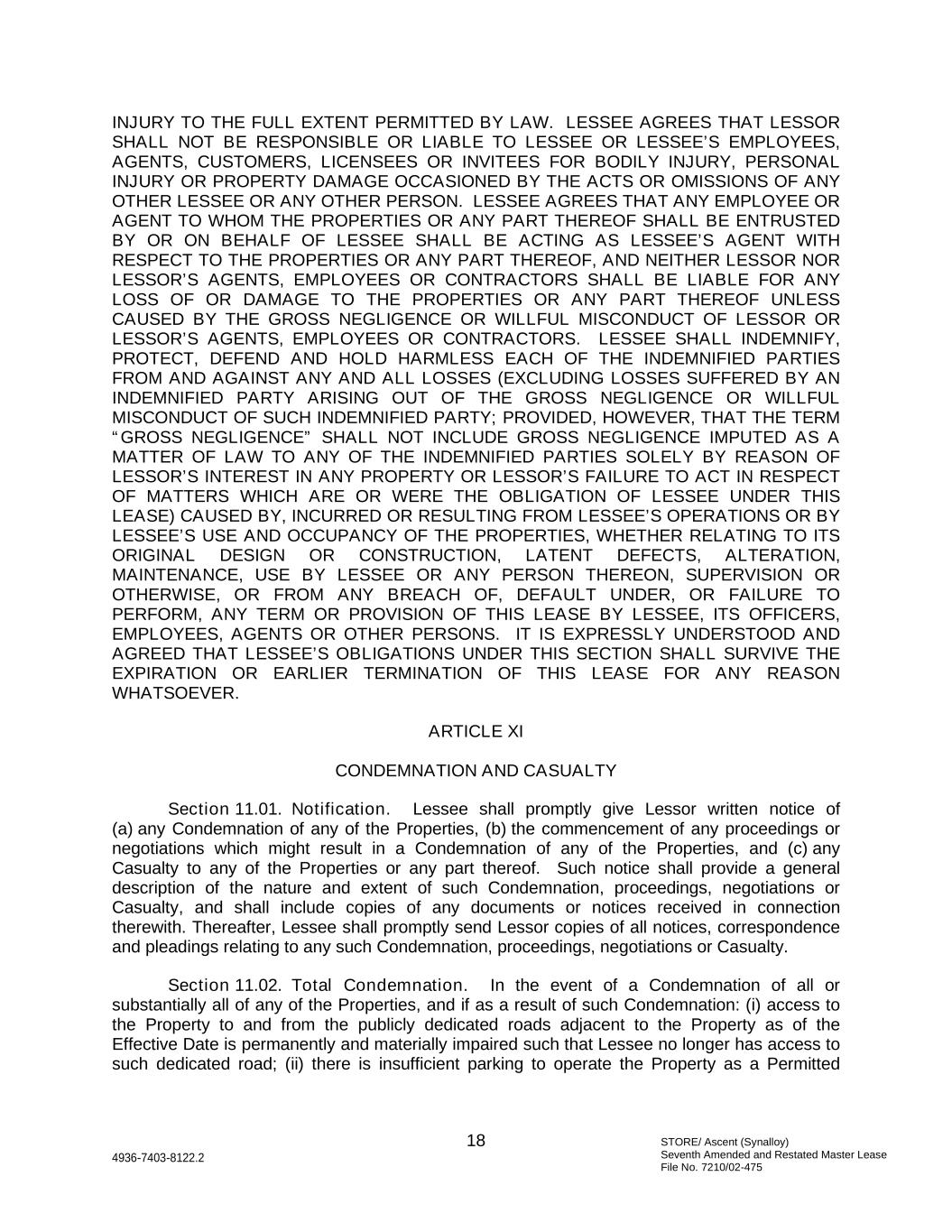 STORE/ Ascent (Synalloy) Seventh Amended and Restated Master Lease File No. 7210/02-475 18 4936-7403-8122.2 INJURY TO THE FULL EXTENT PERMITTED BY LAW. LESSEE AGREES THAT LESSOR SHALL NOT BE RESPONSIBLE OR LIABLE TO LESSEE OR LESSEE’S EMPLOYEES, AGENTS, CUSTOMERS, LICENSEES OR INVITEES FOR BODILY INJURY, PERSONAL INJURY OR PROPERTY DAMAGE OCCASIONED BY THE ACTS OR OMISSIONS OF ANY OTHER LESSEE OR ANY OTHER PERSON. LESSEE AGREES THAT ANY EMPLOYEE OR AGENT TO WHOM THE PROPERTIES OR ANY PART THEREOF SHALL BE ENTRUSTED BY OR ON BEHALF OF LESSEE SHALL BE ACTING AS LESSEE’S AGENT WITH RESPECT TO THE PROPERTIES OR ANY PART THEREOF, AND NEITHER LESSOR NOR LESSOR’S AGENTS, EMPLOYEES OR CONTRACTORS SHALL BE LIABLE FOR ANY LOSS OF OR DAMAGE TO THE PROPERTIES OR ANY PART THEREOF UNLESS CAUSED BY THE GROSS NEGLIGENCE OR WILLFUL MISCONDUCT OF LESSOR OR LESSOR’S AGENTS, EMPLOYEES OR CONTRACTORS. LESSEE SHALL INDEMNIFY, PROTECT, DEFEND AND HOLD HARMLESS EACH OF THE INDEMNIFIED PARTIES FROM AND AGAINST ANY AND ALL LOSSES (EXCLUDING LOSSES SUFFERED BY AN INDEMNIFIED PARTY ARISING OUT OF THE GROSS NEGLIGENCE OR WILLFUL MISCONDUCT OF SUCH INDEMNIFIED PARTY; PROVIDED, HOWEVER, THAT THE TERM “GROSS NEGLIGENCE” SHALL NOT INCLUDE GROSS NEGLIGENCE IMPUTED AS A MATTER OF LAW TO ANY OF THE INDEMNIFIED PARTIES SOLELY BY REASON OF LESSOR’S INTEREST IN ANY PROPERTY OR LESSOR’S FAILURE TO ACT IN RESPECT OF MATTERS WHICH ARE OR WERE THE OBLIGATION OF LESSEE UNDER THIS LEASE) CAUSED BY, INCURRED OR RESULTING FROM LESSEE’S OPERATIONS OR BY LESSEE’S USE AND OCCUPANCY OF THE PROPERTIES, WHETHER RELATING TO ITS ORIGINAL DESIGN OR CONSTRUCTION, LATENT DEFECTS, ALTERATION, MAINTENANCE, USE BY LESSEE OR ANY PERSON THEREON, SUPERVISION OR OTHERWISE, OR FROM ANY BREACH OF, DEFAULT UNDER, OR FAILURE TO PERFORM, ANY TERM OR PROVISION OF THIS LEASE BY LESSEE, ITS OFFICERS, EMPLOYEES, AGENTS OR OTHER PERSONS. IT IS EXPRESSLY UNDERSTOOD AND AGREED THAT LESSEE’S OBLIGATIONS UNDER THIS SECTION SHALL SURVIVE THE EXPIRATION OR EARLIER TERMINATION OF THIS LEASE FOR ANY REASON WHATSOEVER. ARTICLE XI CONDEMNATION AND CASUALTY Section 11.01. Notification. Lessee shall promptly give Lessor written notice of (a) any Condemnation of any of the Properties, (b) the commencement of any proceedings or negotiations which might result in a Condemnation of any of the Properties, and (c) any Casualty to any of the Properties or any part thereof. Such notice shall provide a general description of the nature and extent of such Condemnation, proceedings, negotiations or Casualty, and shall include copies of any documents or notices received in connection therewith. Thereafter, Lessee shall promptly send Lessor copies of all notices, correspondence and pleadings relating to any such Condemnation, proceedings, negotiations or Casualty. Section 11.02. Total Condemnation. In the event of a Condemnation of all or substantially all of any of the Properties, and if as a result of such Condemnation: (i) access to the Property to and from the publicly dedicated roads adjacent to the Property as of the Effective Date is permanently and materially impaired such that Lessee no longer has access to such dedicated road; (ii) there is insufficient parking to operate the Property as a Permitted