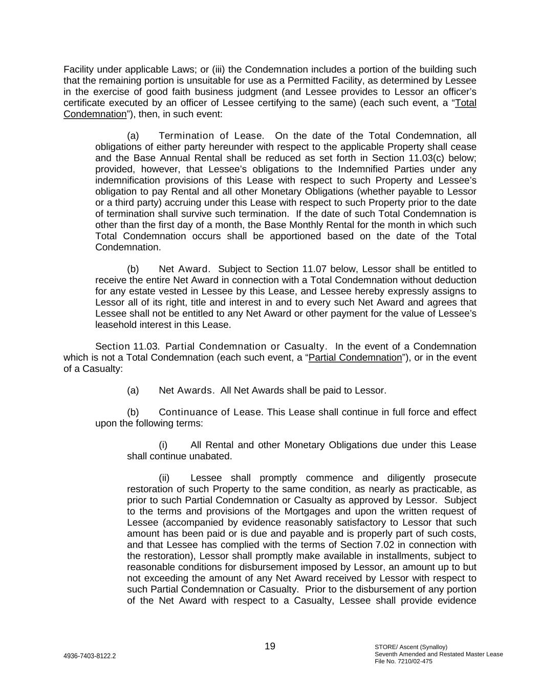 STORE/ Ascent (Synalloy) Seventh Amended and Restated Master Lease File No. 7210/02-475 19 4936-7403-8122.2 Facility under applicable Laws; or (iii) the Condemnation includes a portion of the building such that the remaining portion is unsuitable for use as a Permitted Facility, as determined by Lessee in the exercise of good faith business judgment (and Lessee provides to Lessor an officer’s certificate executed by an officer of Lessee certifying to the same) (each such event, a “Total Condemnation”), then, in such event: (a) Termination of Lease. On the date of the Total Condemnation, all obligations of either party hereunder with respect to the applicable Property shall cease and the Base Annual Rental shall be reduced as set forth in Section 11.03(c) below; provided, however, that Lessee’s obligations to the Indemnified Parties under any indemnification provisions of this Lease with respect to such Property and Lessee’s obligation to pay Rental and all other Monetary Obligations (whether payable to Lessor or a third party) accruing under this Lease with respect to such Property prior to the date of termination shall survive such termination. If the date of such Total Condemnation is other than the first day of a month, the Base Monthly Rental for the month in which such Total Condemnation occurs shall be apportioned based on the date of the Total Condemnation. (b) Net Award. Subject to Section 11.07 below, Lessor shall be entitled to receive the entire Net Award in connection with a Total Condemnation without deduction for any estate vested in Lessee by this Lease, and Lessee hereby expressly assigns to Lessor all of its right, title and interest in and to every such Net Award and agrees that Lessee shall not be entitled to any Net Award or other payment for the value of Lessee’s leasehold interest in this Lease. Section 11.03. Partial Condemnation or Casualty. In the event of a Condemnation which is not a Total Condemnation (each such event, a “Partial Condemnation”), or in the event of a Casualty: (a) Net Awards. All Net Awards shall be paid to Lessor. (b) Continuance of Lease. This Lease shall continue in full force and effect upon the following terms: (i) All Rental and other Monetary Obligations due under this Lease shall continue unabated. (ii) Lessee shall promptly commence and diligently prosecute restoration of such Property to the same condition, as nearly as practicable, as prior to such Partial Condemnation or Casualty as approved by Lessor. Subject to the terms and provisions of the Mortgages and upon the written request of Lessee (accompanied by evidence reasonably satisfactory to Lessor that such amount has been paid or is due and payable and is properly part of such costs, and that Lessee has complied with the terms of Section 7.02 in connection with the restoration), Lessor shall promptly make available in installments, subject to reasonable conditions for disbursement imposed by Lessor, an amount up to but not exceeding the amount of any Net Award received by Lessor with respect to such Partial Condemnation or Casualty. Prior to the disbursement of any portion of the Net Award with respect to a Casualty, Lessee shall provide evidence