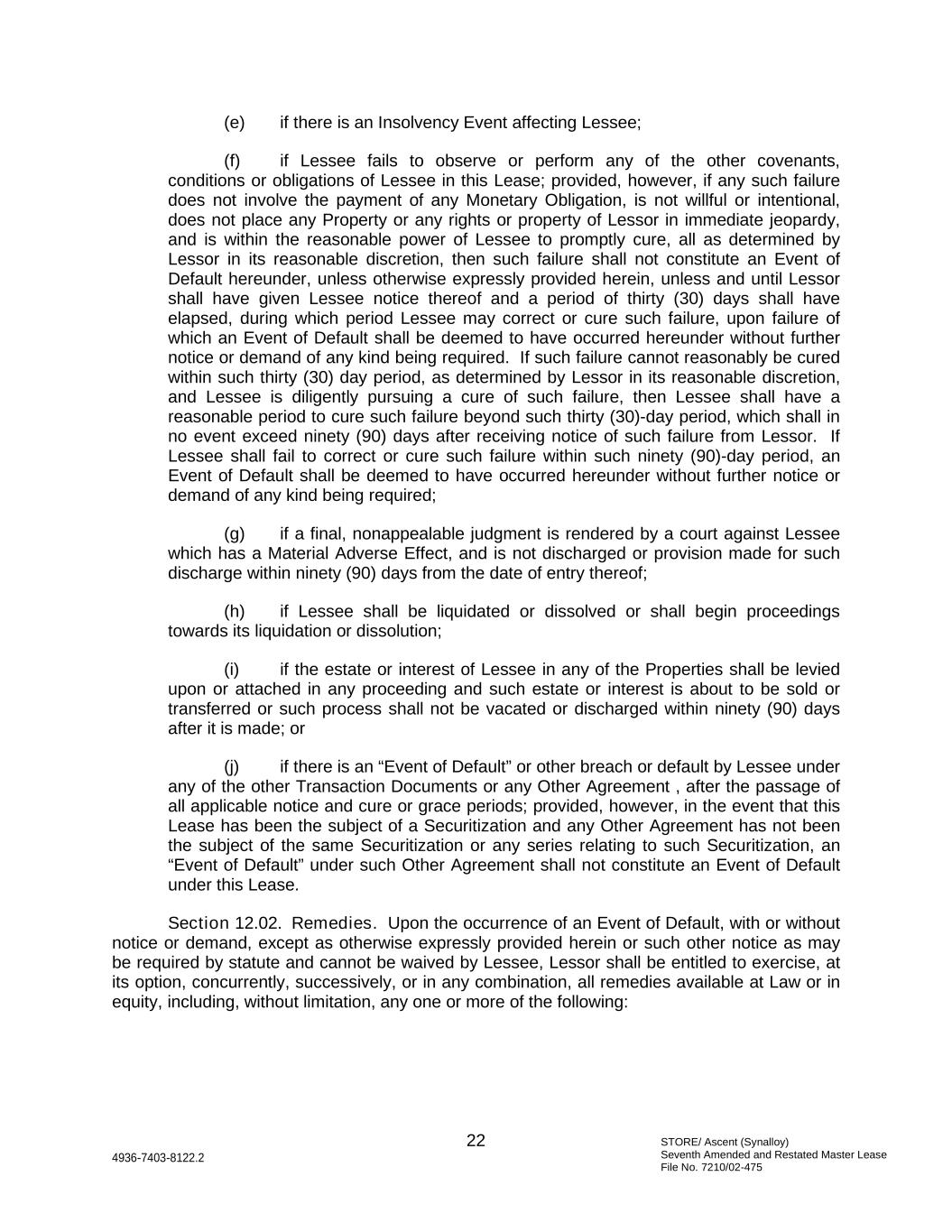 STORE/ Ascent (Synalloy) Seventh Amended and Restated Master Lease File No. 7210/02-475 22 4936-7403-8122.2 (e) if there is an Insolvency Event affecting Lessee; (f) if Lessee fails to observe or perform any of the other covenants, conditions or obligations of Lessee in this Lease; provided, however, if any such failure does not involve the payment of any Monetary Obligation, is not willful or intentional, does not place any Property or any rights or property of Lessor in immediate jeopardy, and is within the reasonable power of Lessee to promptly cure, all as determined by Lessor in its reasonable discretion, then such failure shall not constitute an Event of Default hereunder, unless otherwise expressly provided herein, unless and until Lessor shall have given Lessee notice thereof and a period of thirty (30) days shall have elapsed, during which period Lessee may correct or cure such failure, upon failure of which an Event of Default shall be deemed to have occurred hereunder without further notice or demand of any kind being required. If such failure cannot reasonably be cured within such thirty (30) day period, as determined by Lessor in its reasonable discretion, and Lessee is diligently pursuing a cure of such failure, then Lessee shall have a reasonable period to cure such failure beyond such thirty (30)-day period, which shall in no event exceed ninety (90) days after receiving notice of such failure from Lessor. If Lessee shall fail to correct or cure such failure within such ninety (90)-day period, an Event of Default shall be deemed to have occurred hereunder without further notice or demand of any kind being required; (g) if a final, nonappealable judgment is rendered by a court against Lessee which has a Material Adverse Effect, and is not discharged or provision made for such discharge within ninety (90) days from the date of entry thereof; (h) if Lessee shall be liquidated or dissolved or shall begin proceedings towards its liquidation or dissolution; (i) if the estate or interest of Lessee in any of the Properties shall be levied upon or attached in any proceeding and such estate or interest is about to be sold or transferred or such process shall not be vacated or discharged within ninety (90) days after it is made; or (j) if there is an “Event of Default” or other breach or default by Lessee under any of the other Transaction Documents or any Other Agreement , after the passage of all applicable notice and cure or grace periods; provided, however, in the event that this Lease has been the subject of a Securitization and any Other Agreement has not been the subject of the same Securitization or any series relating to such Securitization, an “Event of Default” under such Other Agreement shall not constitute an Event of Default under this Lease. Section 12.02. Remedies. Upon the occurrence of an Event of Default, with or without notice or demand, except as otherwise expressly provided herein or such other notice as may be required by statute and cannot be waived by Lessee, Lessor shall be entitled to exercise, at its option, concurrently, successively, or in any combination, all remedies available at Law or in equity, including, without limitation, any one or more of the following: