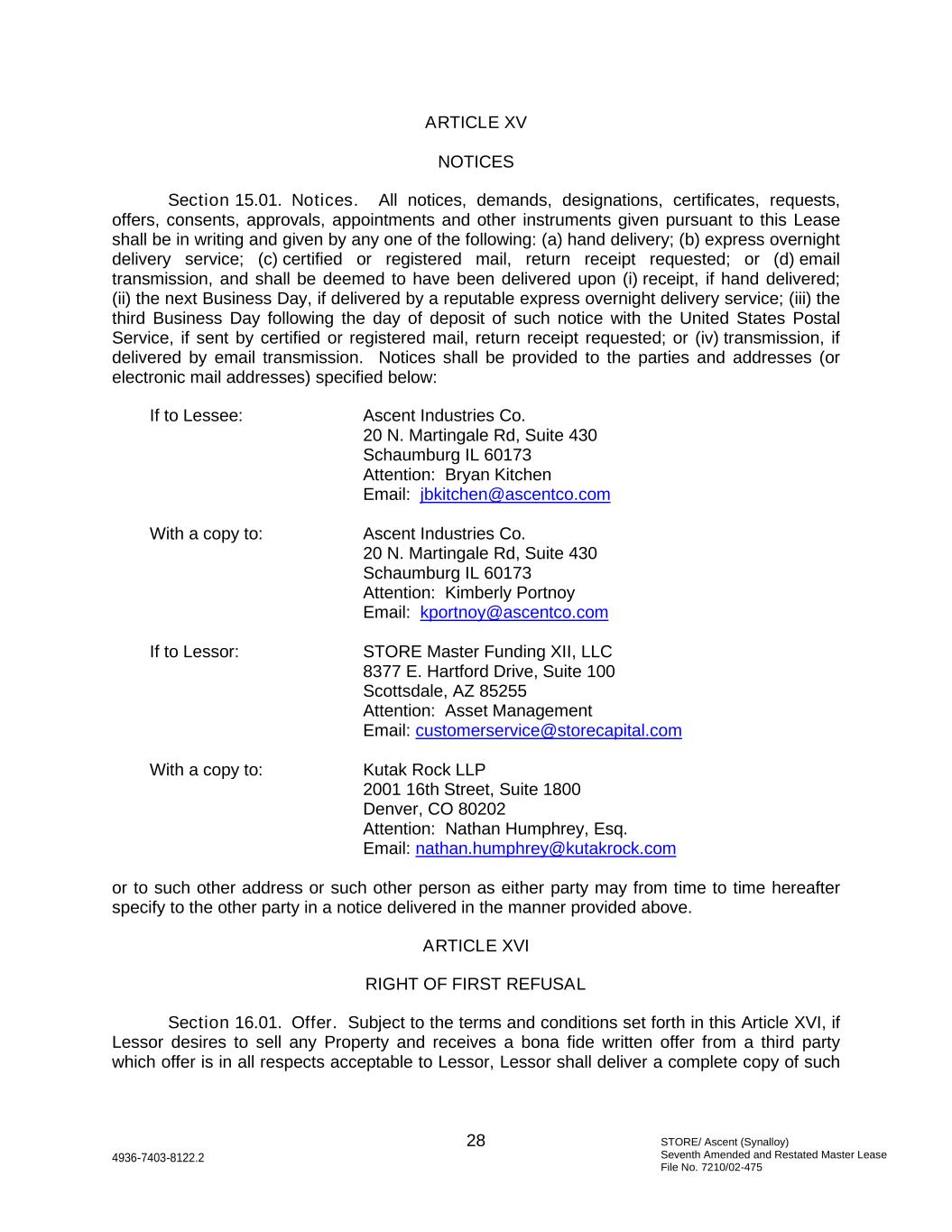 STORE/ Ascent (Synalloy) Seventh Amended and Restated Master Lease File No. 7210/02-475 28 4936-7403-8122.2 ARTICLE XV NOTICES Section 15.01. Notices. All notices, demands, designations, certificates, requests, offers, consents, approvals, appointments and other instruments given pursuant to this Lease shall be in writing and given by any one of the following: (a) hand delivery; (b) express overnight delivery service; (c) certified or registered mail, return receipt requested; or (d) email transmission, and shall be deemed to have been delivered upon (i) receipt, if hand delivered; (ii) the next Business Day, if delivered by a reputable express overnight delivery service; (iii) the third Business Day following the day of deposit of such notice with the United States Postal Service, if sent by certified or registered mail, return receipt requested; or (iv) transmission, if delivered by email transmission. Notices shall be provided to the parties and addresses (or electronic mail addresses) specified below: If to Lessee: Ascent Industries Co. 20 N. Martingale Rd, Suite 430 Schaumburg IL 60173 Attention: Bryan Kitchen Email: jbkitchen@ascentco.com With a copy to: Ascent Industries Co. 20 N. Martingale Rd, Suite 430 Schaumburg IL 60173 Attention: Kimberly Portnoy Email: kportnoy@ascentco.com If to Lessor: STORE Master Funding XII, LLC 8377 E. Hartford Drive, Suite 100 Scottsdale, AZ 85255 Attention: Asset Management Email: customerservice@storecapital.com With a copy to: Kutak Rock LLP 2001 16th Street, Suite 1800 Denver, CO 80202 Attention: Nathan Humphrey, Esq. Email: nathan.humphrey@kutakrock.com or to such other address or such other person as either party may from time to time hereafter specify to the other party in a notice delivered in the manner provided above. ARTICLE XVI RIGHT OF FIRST REFUSAL Section 16.01. Offer. Subject to the terms and conditions set forth in this Article XVI, if Lessor desires to sell any Property and receives a bona fide written offer from a third party which offer is in all respects acceptable to Lessor, Lessor shall deliver a complete copy of such