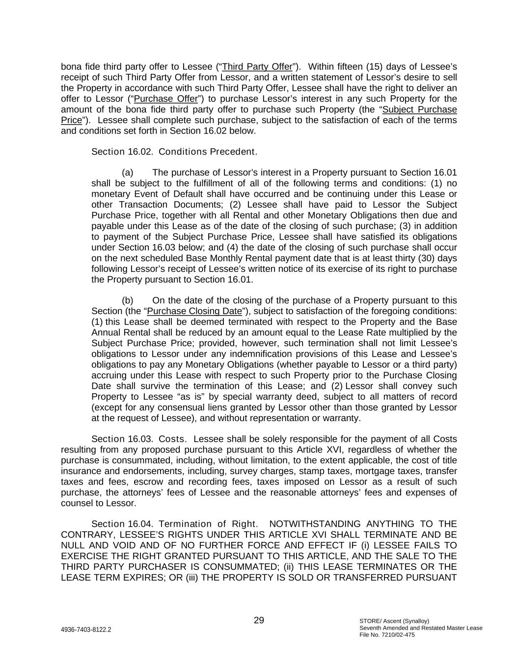 STORE/ Ascent (Synalloy) Seventh Amended and Restated Master Lease File No. 7210/02-475 29 4936-7403-8122.2 bona fide third party offer to Lessee (“Third Party Offer”). Within fifteen (15) days of Lessee’s receipt of such Third Party Offer from Lessor, and a written statement of Lessor’s desire to sell the Property in accordance with such Third Party Offer, Lessee shall have the right to deliver an offer to Lessor (“Purchase Offer”) to purchase Lessor’s interest in any such Property for the amount of the bona fide third party offer to purchase such Property (the “Subject Purchase Price”). Lessee shall complete such purchase, subject to the satisfaction of each of the terms and conditions set forth in Section 16.02 below. Section 16.02. Conditions Precedent. (a) The purchase of Lessor’s interest in a Property pursuant to Section 16.01 shall be subject to the fulfillment of all of the following terms and conditions: (1) no monetary Event of Default shall have occurred and be continuing under this Lease or other Transaction Documents; (2) Lessee shall have paid to Lessor the Subject Purchase Price, together with all Rental and other Monetary Obligations then due and payable under this Lease as of the date of the closing of such purchase; (3) in addition to payment of the Subject Purchase Price, Lessee shall have satisfied its obligations under Section 16.03 below; and (4) the date of the closing of such purchase shall occur on the next scheduled Base Monthly Rental payment date that is at least thirty (30) days following Lessor’s receipt of Lessee’s written notice of its exercise of its right to purchase the Property pursuant to Section 16.01. (b) On the date of the closing of the purchase of a Property pursuant to this Section (the “Purchase Closing Date”), subject to satisfaction of the foregoing conditions: (1) this Lease shall be deemed terminated with respect to the Property and the Base Annual Rental shall be reduced by an amount equal to the Lease Rate multiplied by the Subject Purchase Price; provided, however, such termination shall not limit Lessee’s obligations to Lessor under any indemnification provisions of this Lease and Lessee’s obligations to pay any Monetary Obligations (whether payable to Lessor or a third party) accruing under this Lease with respect to such Property prior to the Purchase Closing Date shall survive the termination of this Lease; and (2) Lessor shall convey such Property to Lessee “as is” by special warranty deed, subject to all matters of record (except for any consensual liens granted by Lessor other than those granted by Lessor at the request of Lessee), and without representation or warranty. Section 16.03. Costs. Lessee shall be solely responsible for the payment of all Costs resulting from any proposed purchase pursuant to this Article XVI, regardless of whether the purchase is consummated, including, without limitation, to the extent applicable, the cost of title insurance and endorsements, including, survey charges, stamp taxes, mortgage taxes, transfer taxes and fees, escrow and recording fees, taxes imposed on Lessor as a result of such purchase, the attorneys’ fees of Lessee and the reasonable attorneys’ fees and expenses of counsel to Lessor. Section 16.04. Termination of Right. NOTWITHSTANDING ANYTHING TO THE CONTRARY, LESSEE’S RIGHTS UNDER THIS ARTICLE XVI SHALL TERMINATE AND BE NULL AND VOID AND OF NO FURTHER FORCE AND EFFECT IF (i) LESSEE FAILS TO EXERCISE THE RIGHT GRANTED PURSUANT TO THIS ARTICLE, AND THE SALE TO THE THIRD PARTY PURCHASER IS CONSUMMATED; (ii) THIS LEASE TERMINATES OR THE LEASE TERM EXPIRES; OR (iii) THE PROPERTY IS SOLD OR TRANSFERRED PURSUANT