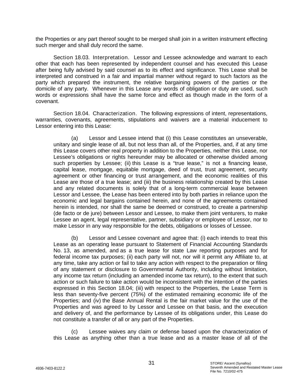 STORE/ Ascent (Synalloy) Seventh Amended and Restated Master Lease File No. 7210/02-475 31 4936-7403-8122.2 the Properties or any part thereof sought to be merged shall join in a written instrument effecting such merger and shall duly record the same. Section 18.03. Interpretation. Lessor and Lessee acknowledge and warrant to each other that each has been represented by independent counsel and has executed this Lease after being fully advised by said counsel as to its effect and significance. This Lease shall be interpreted and construed in a fair and impartial manner without regard to such factors as the party which prepared the instrument, the relative bargaining powers of the parties or the domicile of any party. Whenever in this Lease any words of obligation or duty are used, such words or expressions shall have the same force and effect as though made in the form of a covenant. Section 18.04. Characterization. The following expressions of intent, representations, warranties, covenants, agreements, stipulations and waivers are a material inducement to Lessor entering into this Lease: (a) Lessor and Lessee intend that (i) this Lease constitutes an unseverable, unitary and single lease of all, but not less than all, of the Properties, and, if at any time this Lease covers other real property in addition to the Properties, neither this Lease, nor Lessee’s obligations or rights hereunder may be allocated or otherwise divided among such properties by Lessee; (ii) this Lease is a “true lease,” is not a financing lease, capital lease, mortgage, equitable mortgage, deed of trust, trust agreement, security agreement or other financing or trust arrangement, and the economic realities of this Lease are those of a true lease; and (iii) the business relationship created by this Lease and any related documents is solely that of a long-term commercial lease between Lessor and Lessee, the Lease has been entered into by both parties in reliance upon the economic and legal bargains contained herein, and none of the agreements contained herein is intended, nor shall the same be deemed or construed, to create a partnership (de facto or de jure) between Lessor and Lessee, to make them joint venturers, to make Lessee an agent, legal representative, partner, subsidiary or employee of Lessor, nor to make Lessor in any way responsible for the debts, obligations or losses of Lessee. (b) Lessor and Lessee covenant and agree that: (i) each intends to treat this Lease as an operating lease pursuant to Statement of Financial Accounting Standards No. 13, as amended, and as a true lease for state Law reporting purposes and for federal income tax purposes; (ii) each party will not, nor will it permit any Affiliate to, at any time, take any action or fail to take any action with respect to the preparation or filing of any statement or disclosure to Governmental Authority, including without limitation, any income tax return (including an amended income tax return), to the extent that such action or such failure to take action would be inconsistent with the intention of the parties expressed in this Section 18.04; (iii) with respect to the Properties, the Lease Term is less than seventy-five percent (75%) of the estimated remaining economic life of the Properties; and (iv) the Base Annual Rental is the fair market value for the use of the Properties and was agreed to by Lessor and Lessee on that basis, and the execution and delivery of, and the performance by Lessee of its obligations under, this Lease do not constitute a transfer of all or any part of the Properties. (c) Lessee waives any claim or defense based upon the characterization of this Lease as anything other than a true lease and as a master lease of all of the