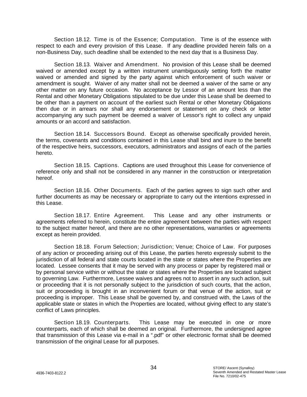 STORE/ Ascent (Synalloy) Seventh Amended and Restated Master Lease File No. 7210/02-475 34 4936-7403-8122.2 Section 18.12. Time is of the Essence; Computation. Time is of the essence with respect to each and every provision of this Lease. If any deadline provided herein falls on a non-Business Day, such deadline shall be extended to the next day that is a Business Day. Section 18.13. Waiver and Amendment. No provision of this Lease shall be deemed waived or amended except by a written instrument unambiguously setting forth the matter waived or amended and signed by the party against which enforcement of such waiver or amendment is sought. Waiver of any matter shall not be deemed a waiver of the same or any other matter on any future occasion. No acceptance by Lessor of an amount less than the Rental and other Monetary Obligations stipulated to be due under this Lease shall be deemed to be other than a payment on account of the earliest such Rental or other Monetary Obligations then due or in arrears nor shall any endorsement or statement on any check or letter accompanying any such payment be deemed a waiver of Lessor’s right to collect any unpaid amounts or an accord and satisfaction. Section 18.14. Successors Bound. Except as otherwise specifically provided herein, the terms, covenants and conditions contained in this Lease shall bind and inure to the benefit of the respective heirs, successors, executors, administrators and assigns of each of the parties hereto. Section 18.15. Captions. Captions are used throughout this Lease for convenience of reference only and shall not be considered in any manner in the construction or interpretation hereof. Section 18.16. Other Documents. Each of the parties agrees to sign such other and further documents as may be necessary or appropriate to carry out the intentions expressed in this Lease. Section 18.17. Entire Agreement. This Lease and any other instruments or agreements referred to herein, constitute the entire agreement between the parties with respect to the subject matter hereof, and there are no other representations, warranties or agreements except as herein provided. Section 18.18. Forum Selection; Jurisdiction; Venue; Choice of Law. For purposes of any action or proceeding arising out of this Lease, the parties hereto expressly submit to the jurisdiction of all federal and state courts located in the state or states where the Properties are located. Lessee consents that it may be served with any process or paper by registered mail or by personal service within or without the state or states where the Properties are located subject to governing Law. Furthermore, Lessee waives and agrees not to assert in any such action, suit or proceeding that it is not personally subject to the jurisdiction of such courts, that the action, suit or proceeding is brought in an inconvenient forum or that venue of the action, suit or proceeding is improper. This Lease shall be governed by, and construed with, the Laws of the applicable state or states in which the Properties are located, without giving effect to any state’s conflict of Laws principles. Section 18.19. Counterparts. This Lease may be executed in one or more counterparts, each of which shall be deemed an original. Furthermore, the undersigned agree that transmission of this Lease via e-mail in a “.pdf” or other electronic format shall be deemed transmission of the original Lease for all purposes.