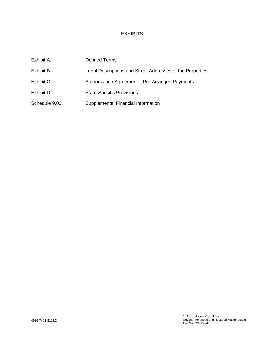 STORE/ Ascent (Synalloy) Seventh Amended and Restated Master Lease File No. 7210/02-475 4936-7403-8122.2 EXHIBITS Exhibit A: Defined Terms Exhibit B: Legal Descriptions and Street Addresses of the Properties Exhibit C: Authorization Agreement – Pre-Arranged Payments Exhibit D: State-Specific Provisions Schedule 9.03 Supplemental Financial Information