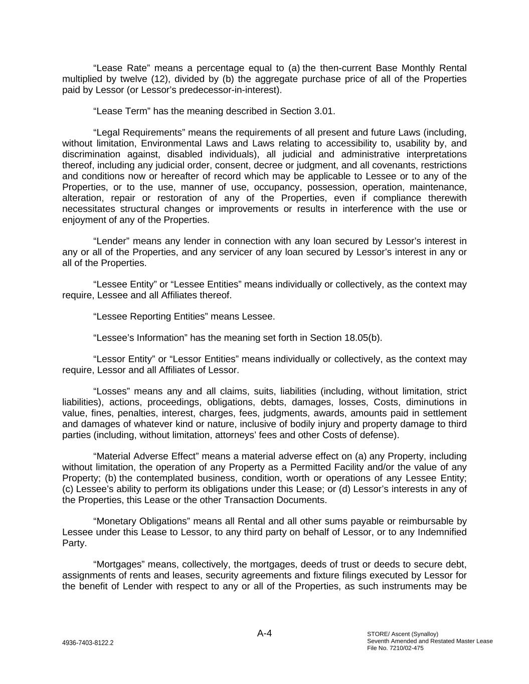 STORE/ Ascent (Synalloy) Seventh Amended and Restated Master Lease File No. 7210/02-475 A-4 4936-7403-8122.2 “Lease Rate” means a percentage equal to (a) the then-current Base Monthly Rental multiplied by twelve (12), divided by (b) the aggregate purchase price of all of the Properties paid by Lessor (or Lessor’s predecessor-in-interest). “Lease Term” has the meaning described in Section 3.01. “Legal Requirements” means the requirements of all present and future Laws (including, without limitation, Environmental Laws and Laws relating to accessibility to, usability by, and discrimination against, disabled individuals), all judicial and administrative interpretations thereof, including any judicial order, consent, decree or judgment, and all covenants, restrictions and conditions now or hereafter of record which may be applicable to Lessee or to any of the Properties, or to the use, manner of use, occupancy, possession, operation, maintenance, alteration, repair or restoration of any of the Properties, even if compliance therewith necessitates structural changes or improvements or results in interference with the use or enjoyment of any of the Properties. “Lender” means any lender in connection with any loan secured by Lessor’s interest in any or all of the Properties, and any servicer of any loan secured by Lessor’s interest in any or all of the Properties. “Lessee Entity” or “Lessee Entities” means individually or collectively, as the context may require, Lessee and all Affiliates thereof. “Lessee Reporting Entities” means Lessee. “Lessee’s Information” has the meaning set forth in Section 18.05(b). “Lessor Entity” or “Lessor Entities” means individually or collectively, as the context may require, Lessor and all Affiliates of Lessor. “Losses” means any and all claims, suits, liabilities (including, without limitation, strict liabilities), actions, proceedings, obligations, debts, damages, losses, Costs, diminutions in value, fines, penalties, interest, charges, fees, judgments, awards, amounts paid in settlement and damages of whatever kind or nature, inclusive of bodily injury and property damage to third parties (including, without limitation, attorneys’ fees and other Costs of defense). “Material Adverse Effect” means a material adverse effect on (a) any Property, including without limitation, the operation of any Property as a Permitted Facility and/or the value of any Property; (b) the contemplated business, condition, worth or operations of any Lessee Entity; (c) Lessee’s ability to perform its obligations under this Lease; or (d) Lessor’s interests in any of the Properties, this Lease or the other Transaction Documents. “Monetary Obligations” means all Rental and all other sums payable or reimbursable by Lessee under this Lease to Lessor, to any third party on behalf of Lessor, or to any Indemnified Party. “Mortgages” means, collectively, the mortgages, deeds of trust or deeds to secure debt, assignments of rents and leases, security agreements and fixture filings executed by Lessor for the benefit of Lender with respect to any or all of the Properties, as such instruments may be