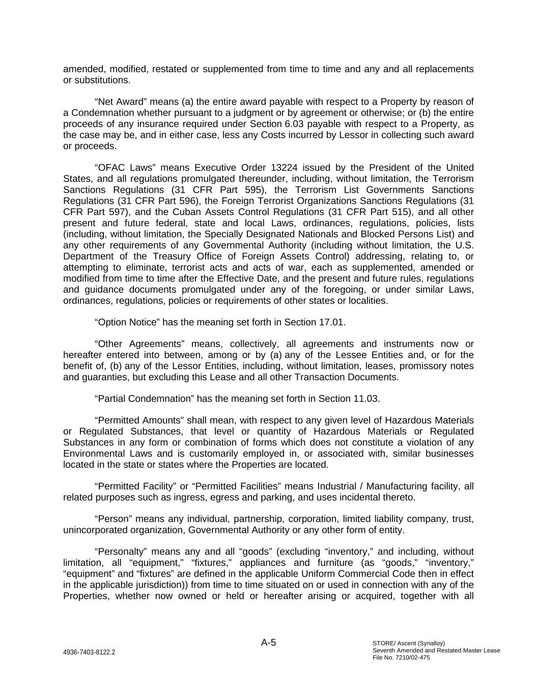 STORE/ Ascent (Synalloy) Seventh Amended and Restated Master Lease File No. 7210/02-475 A-5 4936-7403-8122.2 amended, modified, restated or supplemented from time to time and any and all replacements or substitutions. “Net Award” means (a) the entire award payable with respect to a Property by reason of a Condemnation whether pursuant to a judgment or by agreement or otherwise; or (b) the entire proceeds of any insurance required under Section 6.03 payable with respect to a Property, as the case may be, and in either case, less any Costs incurred by Lessor in collecting such award or proceeds. “OFAC Laws” means Executive Order 13224 issued by the President of the United States, and all regulations promulgated thereunder, including, without limitation, the Terrorism Sanctions Regulations (31 CFR Part 595), the Terrorism List Governments Sanctions Regulations (31 CFR Part 596), the Foreign Terrorist Organizations Sanctions Regulations (31 CFR Part 597), and the Cuban Assets Control Regulations (31 CFR Part 515), and all other present and future federal, state and local Laws, ordinances, regulations, policies, lists (including, without limitation, the Specially Designated Nationals and Blocked Persons List) and any other requirements of any Governmental Authority (including without limitation, the U.S. Department of the Treasury Office of Foreign Assets Control) addressing, relating to, or attempting to eliminate, terrorist acts and acts of war, each as supplemented, amended or modified from time to time after the Effective Date, and the present and future rules, regulations and guidance documents promulgated under any of the foregoing, or under similar Laws, ordinances, regulations, policies or requirements of other states or localities. “Option Notice” has the meaning set forth in Section 17.01. “Other Agreements” means, collectively, all agreements and instruments now or hereafter entered into between, among or by (a) any of the Lessee Entities and, or for the benefit of, (b) any of the Lessor Entities, including, without limitation, leases, promissory notes and guaranties, but excluding this Lease and all other Transaction Documents. “Partial Condemnation” has the meaning set forth in Section 11.03. “Permitted Amounts” shall mean, with respect to any given level of Hazardous Materials or Regulated Substances, that level or quantity of Hazardous Materials or Regulated Substances in any form or combination of forms which does not constitute a violation of any Environmental Laws and is customarily employed in, or associated with, similar businesses located in the state or states where the Properties are located. “Permitted Facility” or “Permitted Facilities” means Industrial / Manufacturing facility, all related purposes such as ingress, egress and parking, and uses incidental thereto. “Person” means any individual, partnership, corporation, limited liability company, trust, unincorporated organization, Governmental Authority or any other form of entity. “Personalty” means any and all “goods” (excluding “inventory,” and including, without limitation, all “equipment,” “fixtures,” appliances and furniture (as “goods,” “inventory,” “equipment” and “fixtures” are defined in the applicable Uniform Commercial Code then in effect in the applicable jurisdiction)) from time to time situated on or used in connection with any of the Properties, whether now owned or held or hereafter arising or acquired, together with all