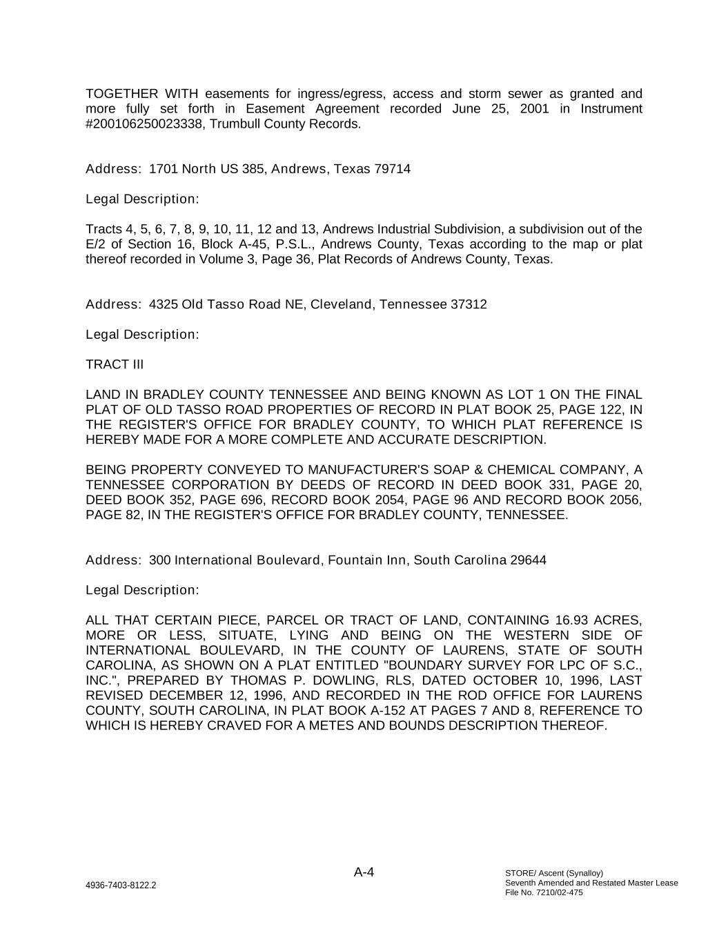 STORE/ Ascent (Synalloy) Seventh Amended and Restated Master Lease File No. 7210/02-475 A-4 4936-7403-8122.2 TOGETHER WITH easements for ingress/egress, access and storm sewer as granted and more fully set forth in Easement Agreement recorded June 25, 2001 in Instrument #200106250023338, Trumbull County Records. Address: 1701 North US 385, Andrews, Texas 79714 Legal Description: Tracts 4, 5, 6, 7, 8, 9, 10, 11, 12 and 13, Andrews Industrial Subdivision, a subdivision out of the E/2 of Section 16, Block A-45, P.S.L., Andrews County, Texas according to the map or plat thereof recorded in Volume 3, Page 36, Plat Records of Andrews County, Texas. Address: 4325 Old Tasso Road NE, Cleveland, Tennessee 37312 Legal Description: TRACT III LAND IN BRADLEY COUNTY TENNESSEE AND BEING KNOWN AS LOT 1 ON THE FINAL PLAT OF OLD TASSO ROAD PROPERTIES OF RECORD IN PLAT BOOK 25, PAGE 122, IN THE REGISTER'S OFFICE FOR BRADLEY COUNTY, TO WHICH PLAT REFERENCE IS HEREBY MADE FOR A MORE COMPLETE AND ACCURATE DESCRIPTION. BEING PROPERTY CONVEYED TO MANUFACTURER'S SOAP & CHEMICAL COMPANY, A TENNESSEE CORPORATION BY DEEDS OF RECORD IN DEED BOOK 331, PAGE 20, DEED BOOK 352, PAGE 696, RECORD BOOK 2054, PAGE 96 AND RECORD BOOK 2056, PAGE 82, IN THE REGISTER'S OFFICE FOR BRADLEY COUNTY, TENNESSEE. Address: 300 International Boulevard, Fountain Inn, South Carolina 29644 Legal Description: ALL THAT CERTAIN PIECE, PARCEL OR TRACT OF LAND, CONTAINING 16.93 ACRES, MORE OR LESS, SITUATE, LYING AND BEING ON THE WESTERN SIDE OF INTERNATIONAL BOULEVARD, IN THE COUNTY OF LAURENS, STATE OF SOUTH CAROLINA, AS SHOWN ON A PLAT ENTITLED "BOUNDARY SURVEY FOR LPC OF S.C., INC.", PREPARED BY THOMAS P. DOWLING, RLS, DATED OCTOBER 10, 1996, LAST REVISED DECEMBER 12, 1996, AND RECORDED IN THE ROD OFFICE FOR LAURENS COUNTY, SOUTH CAROLINA, IN PLAT BOOK A-152 AT PAGES 7 AND 8, REFERENCE TO WHICH IS HEREBY CRAVED FOR A METES AND BOUNDS DESCRIPTION THEREOF.