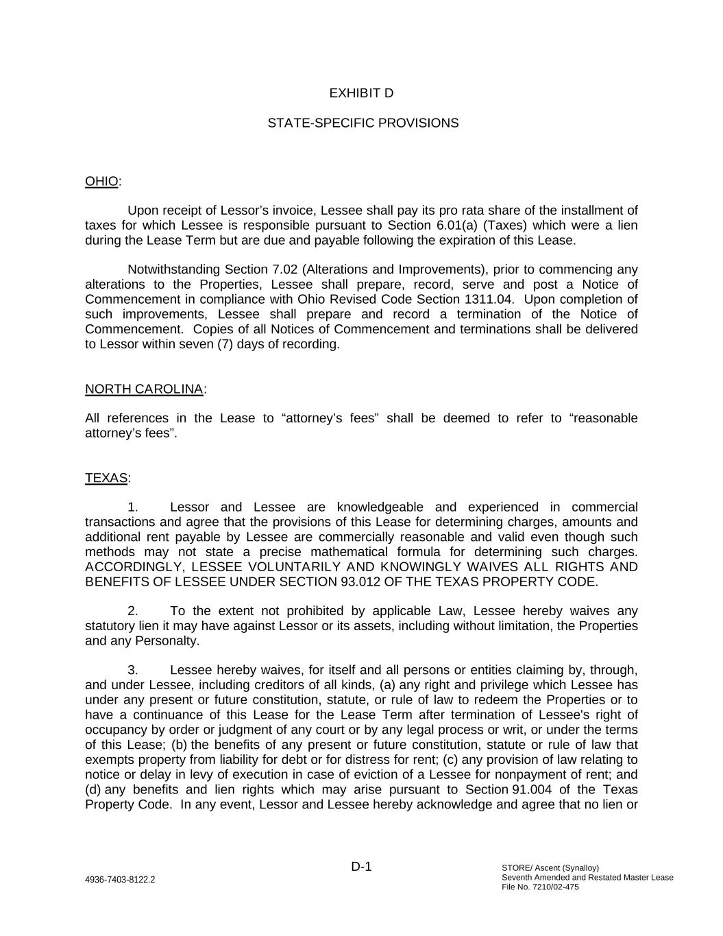 STORE/ Ascent (Synalloy) Seventh Amended and Restated Master Lease File No. 7210/02-475 D-1 4936-7403-8122.2 EXHIBIT D STATE-SPECIFIC PROVISIONS OHIO: Upon receipt of Lessor’s invoice, Lessee shall pay its pro rata share of the installment of taxes for which Lessee is responsible pursuant to Section 6.01(a) (Taxes) which were a lien during the Lease Term but are due and payable following the expiration of this Lease. Notwithstanding Section 7.02 (Alterations and Improvements), prior to commencing any alterations to the Properties, Lessee shall prepare, record, serve and post a Notice of Commencement in compliance with Ohio Revised Code Section 1311.04. Upon completion of such improvements, Lessee shall prepare and record a termination of the Notice of Commencement. Copies of all Notices of Commencement and terminations shall be delivered to Lessor within seven (7) days of recording. NORTH CAROLINA: All references in the Lease to “attorney’s fees” shall be deemed to refer to “reasonable attorney’s fees”. TEXAS: 1. Lessor and Lessee are knowledgeable and experienced in commercial transactions and agree that the provisions of this Lease for determining charges, amounts and additional rent payable by Lessee are commercially reasonable and valid even though such methods may not state a precise mathematical formula for determining such charges. ACCORDINGLY, LESSEE VOLUNTARILY AND KNOWINGLY WAIVES ALL RIGHTS AND BENEFITS OF LESSEE UNDER SECTION 93.012 OF THE TEXAS PROPERTY CODE. 2. To the extent not prohibited by applicable Law, Lessee hereby waives any statutory lien it may have against Lessor or its assets, including without limitation, the Properties and any Personalty. 3. Lessee hereby waives, for itself and all persons or entities claiming by, through, and under Lessee, including creditors of all kinds, (a) any right and privilege which Lessee has under any present or future constitution, statute, or rule of law to redeem the Properties or to have a continuance of this Lease for the Lease Term after termination of Lessee's right of occupancy by order or judgment of any court or by any legal process or writ, or under the terms of this Lease; (b) the benefits of any present or future constitution, statute or rule of law that exempts property from liability for debt or for distress for rent; (c) any provision of law relating to notice or delay in levy of execution in case of eviction of a Lessee for nonpayment of rent; and (d) any benefits and lien rights which may arise pursuant to Section 91.004 of the Texas Property Code. In any event, Lessor and Lessee hereby acknowledge and agree that no lien or