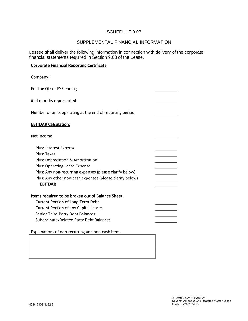 STORE/ Ascent (Synalloy) Seventh Amended and Restated Master Lease File No. 7210/02-475 4936-7403-8122.2 SCHEDULE 9.03 SUPPLEMENTAL FINANCIAL INFORMATION Lessee shall deliver the following information in connection with delivery of the corporate financial statements required in Section 9.03 of the Lease. Corporate Financial Reporting Certificate Company: For the Qtr or FYE ending # of months represented Number of units operating at the end of reporting period EBITDAR Calculation: Net Income Plus: Interest Expense Plus: Taxes Plus: Depreciation & Amortization Plus: Operating Lease Expense Plus: Any non-recurring expenses (please clarify below) Plus: Any other non-cash expenses (please clarify below) EBITDAR Items required to be broken out of Balance Sheet: Current Portion of Long-Term Debt Current Portion of any Capital Leases Senior Third-Party Debt Balances Subordinate/Related Party Debt Balances Explanations of non-recurring and non-cash items: