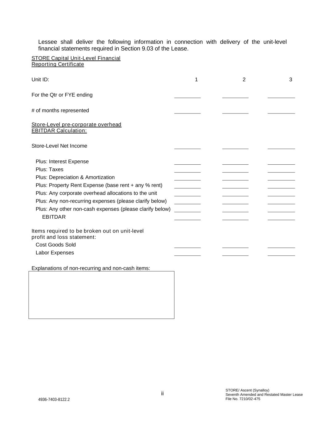 STORE/ Ascent (Synalloy) Seventh Amended and Restated Master Lease File No. 7210/02-475 ii 4936-7403-8122.2 Lessee shall deliver the following information in connection with delivery of the unit-level financial statements required in Section 9.03 of the Lease. STORE Capital Unit-Level Financial Reporting Certificate Unit ID: 1 2 3 For the Qtr or FYE ending # of months represented Store-Level pre-corporate overhead EBITDAR Calculation: Store-Level Net Income Plus: Interest Expense Plus: Taxes Plus: Depreciation & Amortization Plus: Property Rent Expense (base rent + any % rent) Plus: Any corporate overhead allocations to the unit Plus: Any non-recurring expenses (please clarify below) Plus: Any other non-cash expenses (please clarify below) EBITDAR Items required to be broken out on unit-level profit and loss statement: Cost Goods Sold Labor Expenses Explanations of non-recurring and non-cash items: