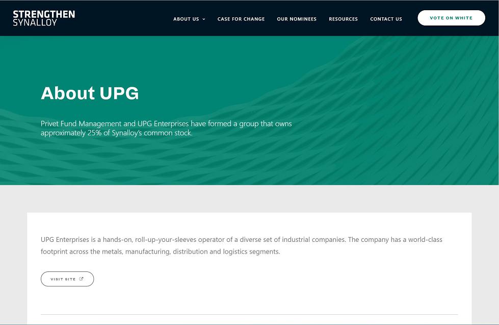 ATLANTA--(BUSINESS WIRE)--Privet Fund Management LLC (together with its affiliates, “Privet”) and UPG Enterprises LLC (“UPG”), which collectively own approximately 24.9% of the outstanding common stock of Synalloy Corporation (NASDAQ: SYNL) (“Synalloy” or the “Company”), have filed a definitive proxy statement with the Securities and Exchange Commission and today issued the below letter to the Company’s stockholders. Privet and UPG have nominated a slate of five highly-qualified and experienced director candidates for election to Synalloy’s eight-member Board of Directors at the Company’s 2020 Annual Meeting of Stockholders.