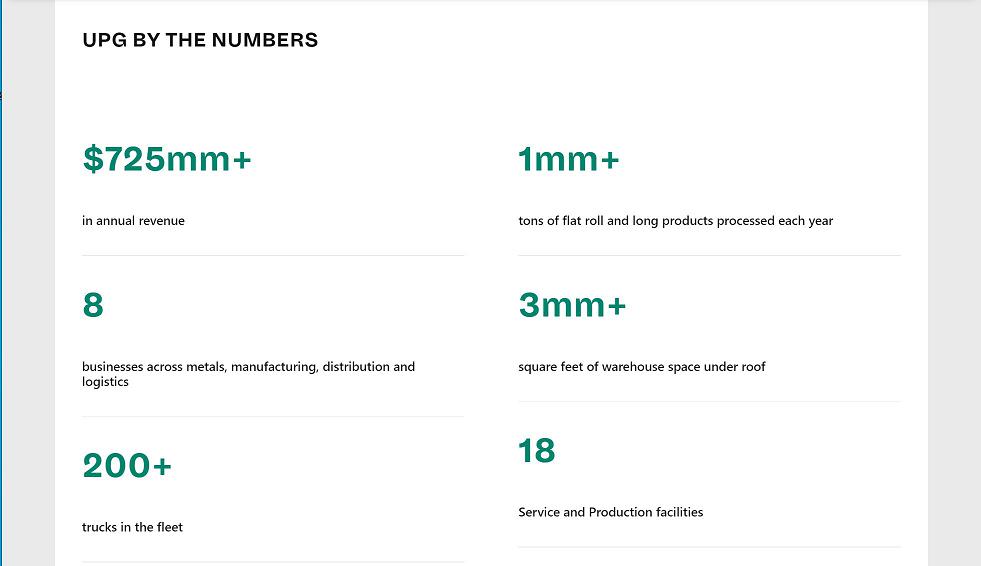 UPG Enterprises LLC is a strategic operator of a portfolio of metals and logistics companies. With locations throughout North America, its operations include Chicago Steel, Contractors Steel, Lamination Specialties, Maksteel, Mapes & Sprowl Steel, Metalex, Morton Rail Products and National Metalwares. Founded by families with multi-generational experience in steel, real estate and logistics, the company prides itself on having the integrity of a family-owned business with an entrepreneurial spirit.