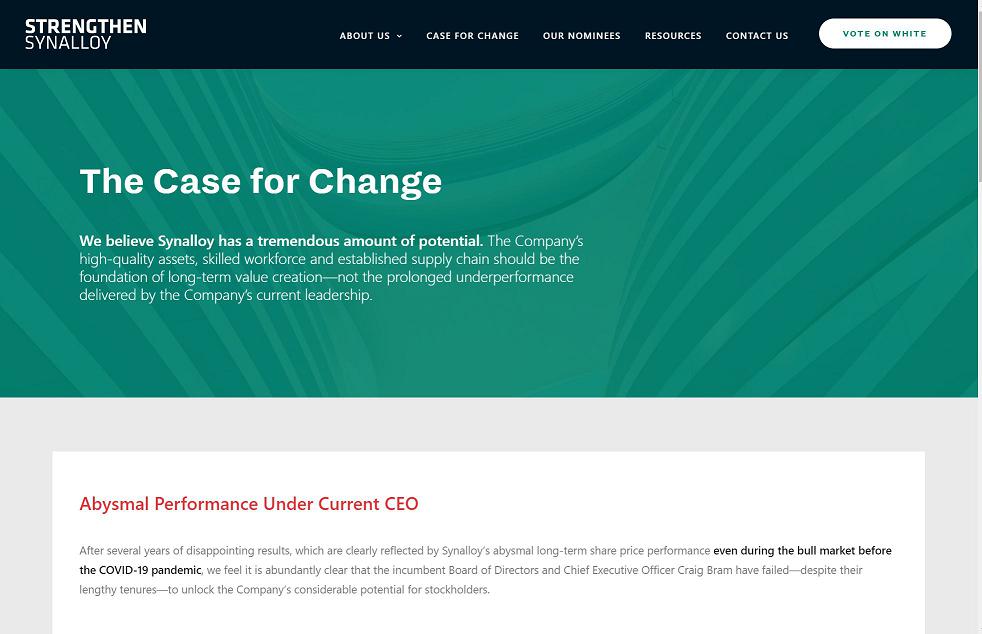 Launches www.StrengthenSynalloy.com to Provide Additional Information Regarding the Need for Immediate Change Atop Synalloy