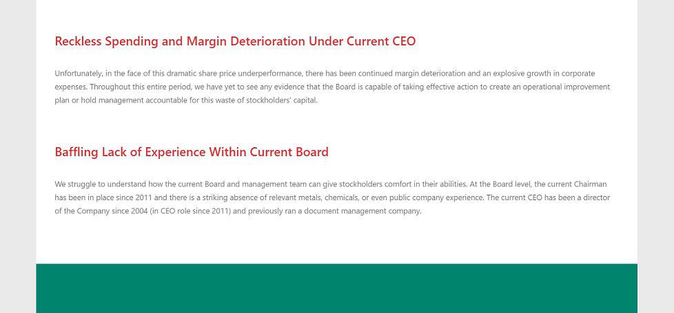 | · | Successful operating expertise in the chemicals and metals sectors. Three of our five nominees – Christopher Hutter, Aldo Mazzaferro and John Schauerman – have extensive, hands-on experience in the metals and industrial space. Mr. Hutter is a proven organizational leader in the metals sector who has grown UPG Enterprises’ annual revenues to more than $725 million since its inception in 2014. Mr. Mazzaferro possesses vast knowledge of the steel and metals sectors based on many years of tangible experience as a research analyst, portfolio manager and corporate executive where he has received numerous accolades for his work. Mr. Schauerman is a seasoned operating executive in the construction and infrastructure industries with years of experience developing corporate strategy, implementing cost controls and executing value-creating mergers and acquisitions. |