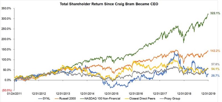 However, if stockholders continue to hitch their wagon to the incumbent directors and Chief Executive Officer (“CEO”) Craig Bram, we fear that Synalloy will remain mired in the same failing culture that has destroyed more than $100 million of value in recent years. Mr. Bram is in his tenth year running Synalloy despite the fact that he had no experience leading a metals or chemicals company prior to being appointed by the Board. We have concluded that his lack of experience, combined with the Board’s weak oversight, directly contributed to the Company’s stock price underperforming the Russell 2000 by more than 100% over the past decade. Despite this inadequate performance, the incumbent directors used their positions to compensate Mr. Bram very generously with average annual compensation of nearly $1 million and a bonus every single year.