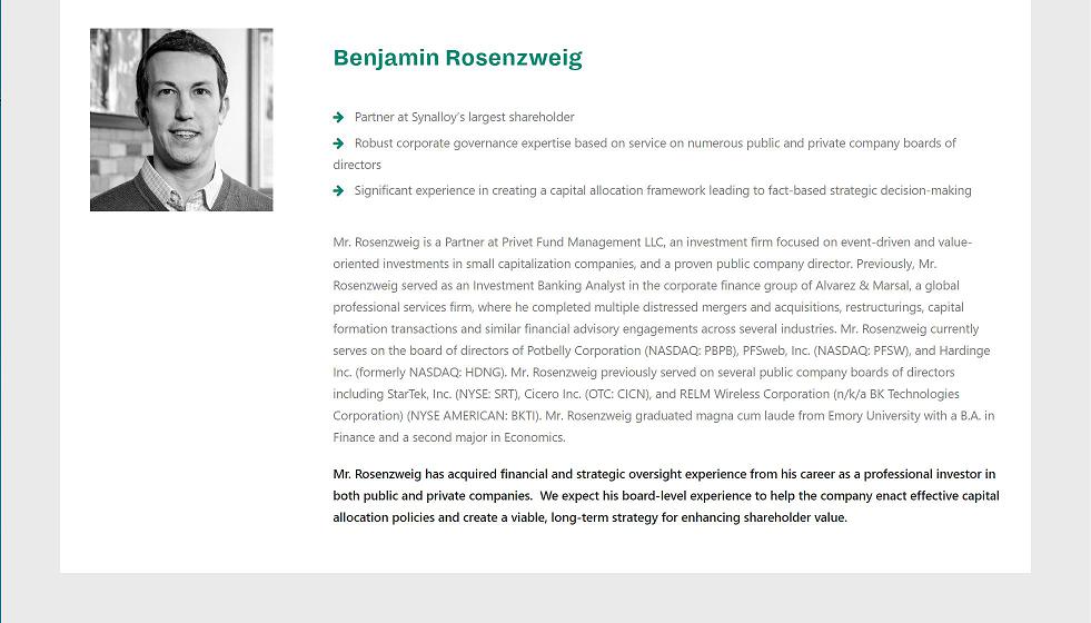 | 4. | Ben Rosenzweig is a Partner at Privet Fund Management LLC, Synalloy’s largest stockholder, and has an extensive track record as both an investor in business-to-business companies and a public and private company director. |