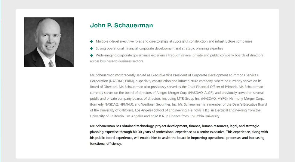 | 5. | John Schauerman most recently served as Executive Vice President of Corporate Development at Primoris Services Corporation (NASDAQ: PRIM), a specialty construction and infrastructure company, after formerly serving as its Chief Financial Officer, and has extensive executive and public and private company director experience across a broad range of successful industrial businesses. |