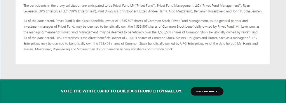 In response to our campaign, we believe the current Board has shown that it is incapable of refuting the objective facts about its abysmal track record managing stockholders’ capital. The directors are now spending all of their effort – and a meaningful amount of corporate resources that belong to stockholders – waging a low-road smear campaign against Privet and UPG that is anchored by a false, desperate narrative. They seem to feel that misrepresenting our intentions and misleading stockholders will mask their own lack of relevant qualifications and the absence of any tangible plan to turn the Company around. Unfortunately for them, this election contest to decide the future of Synalloy will ultimately be determined by facts, not misinformation.