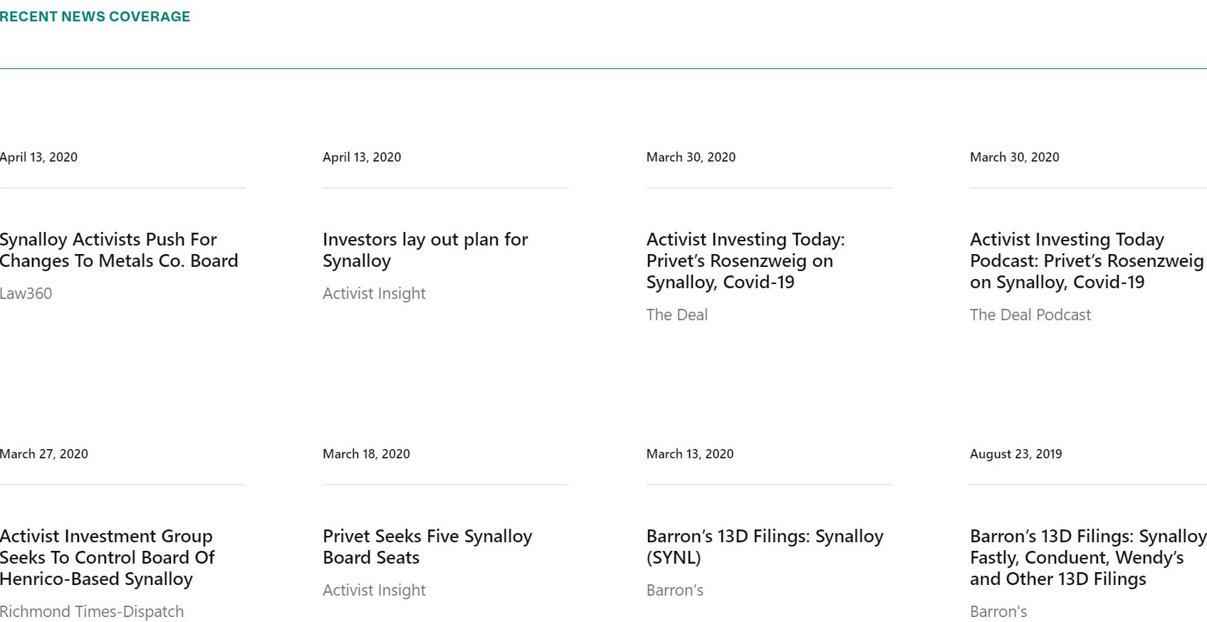 Item 2: On April 14, 2020, the following materials were posted by the Stockholder Group to www.StrengthenSynalloy.com.